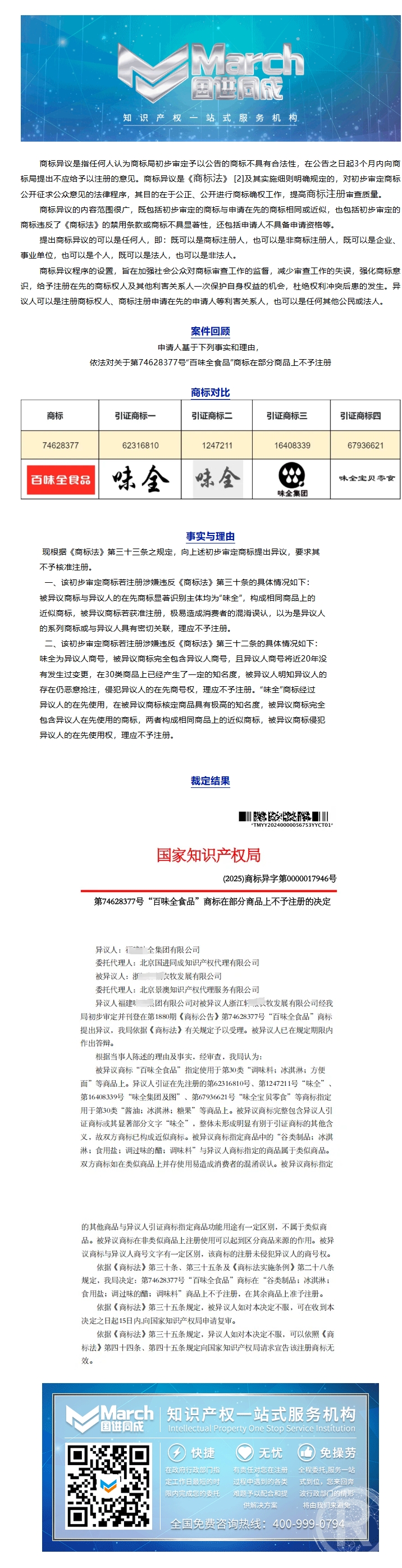 国进同成成功案例 | 关于第74628377号“百味全食品”商标在部分商品上不予注册的决定(提出异议)