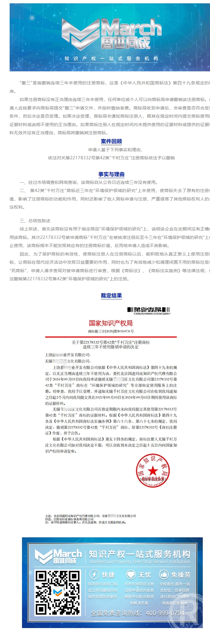 国进同成成功案例︱关于第22178332号第42类"千村万庄"注册商标连续三年不使用撤销申请的决定