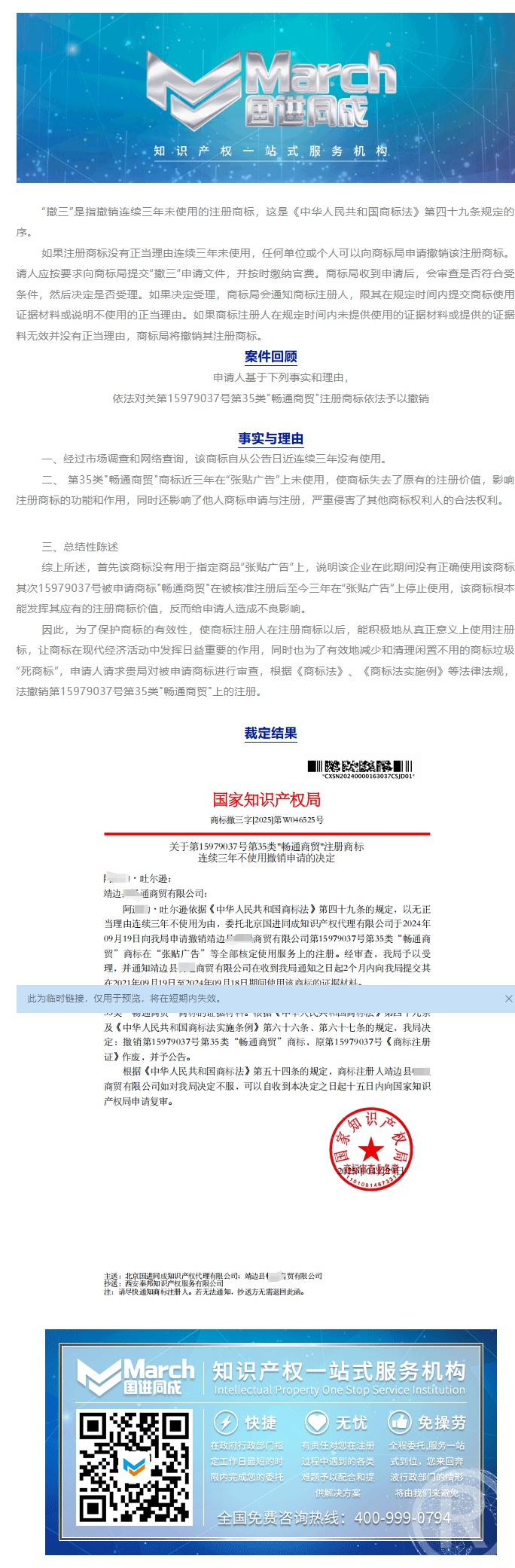 国进同成成功案例︱关于第15979037号第35类"畅通商贸"注册商标连续三年不使用撤销申请的决定
