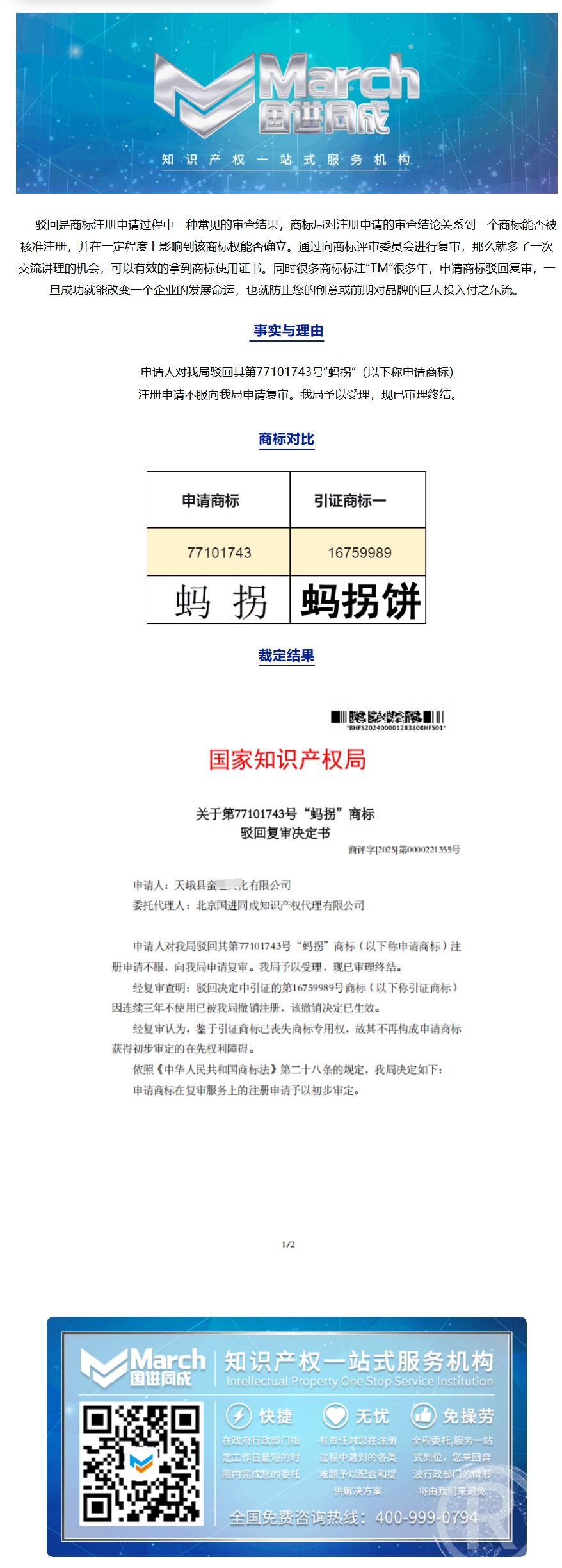 国进同成成功案例 | 关于第77101743号“蚂拐”商标驳回复审决定书