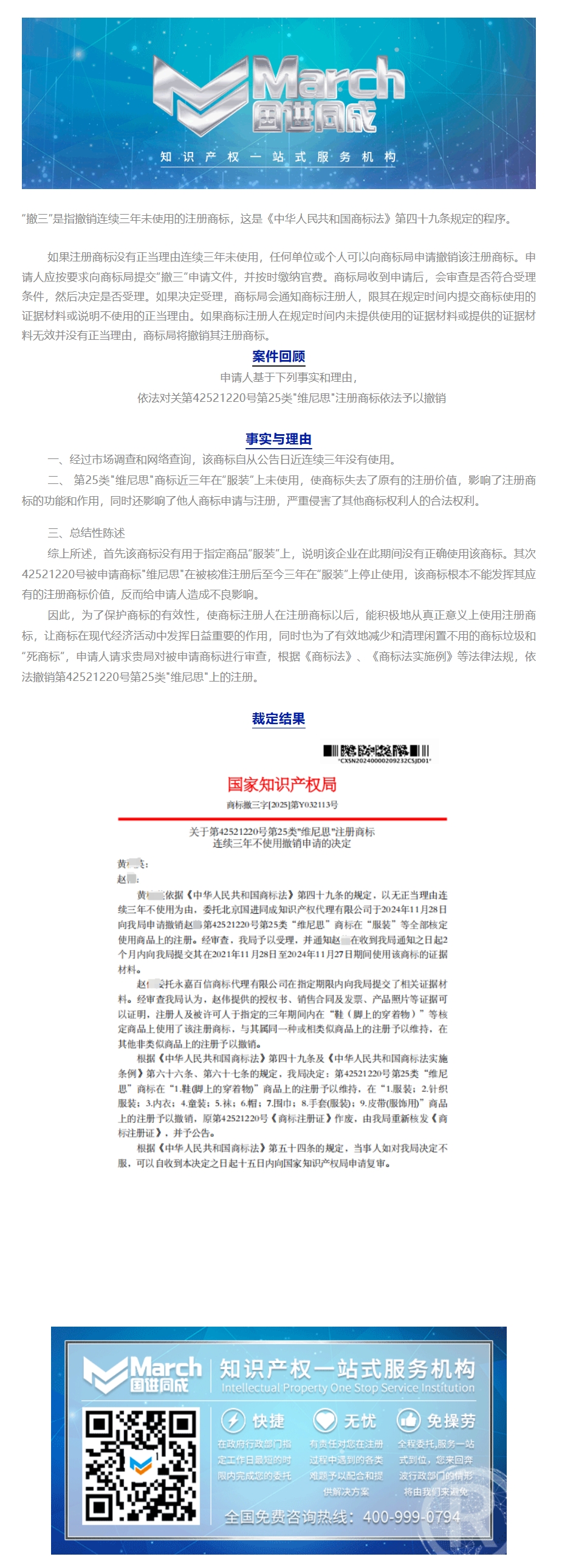 国进同成成功案例︱关于第42521220号第25类"维尼思"注册商标连续三年不使用撤销申请的决定
