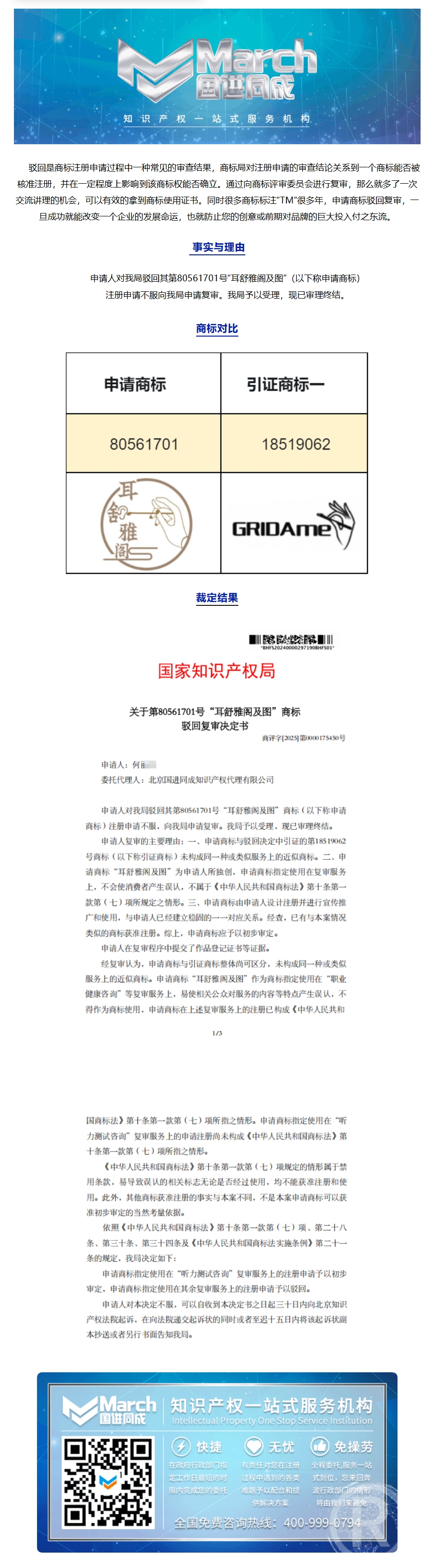 国进同成成功案例 | 关于第80561701号“耳舒雅阁及图”商标驳回复审决定书