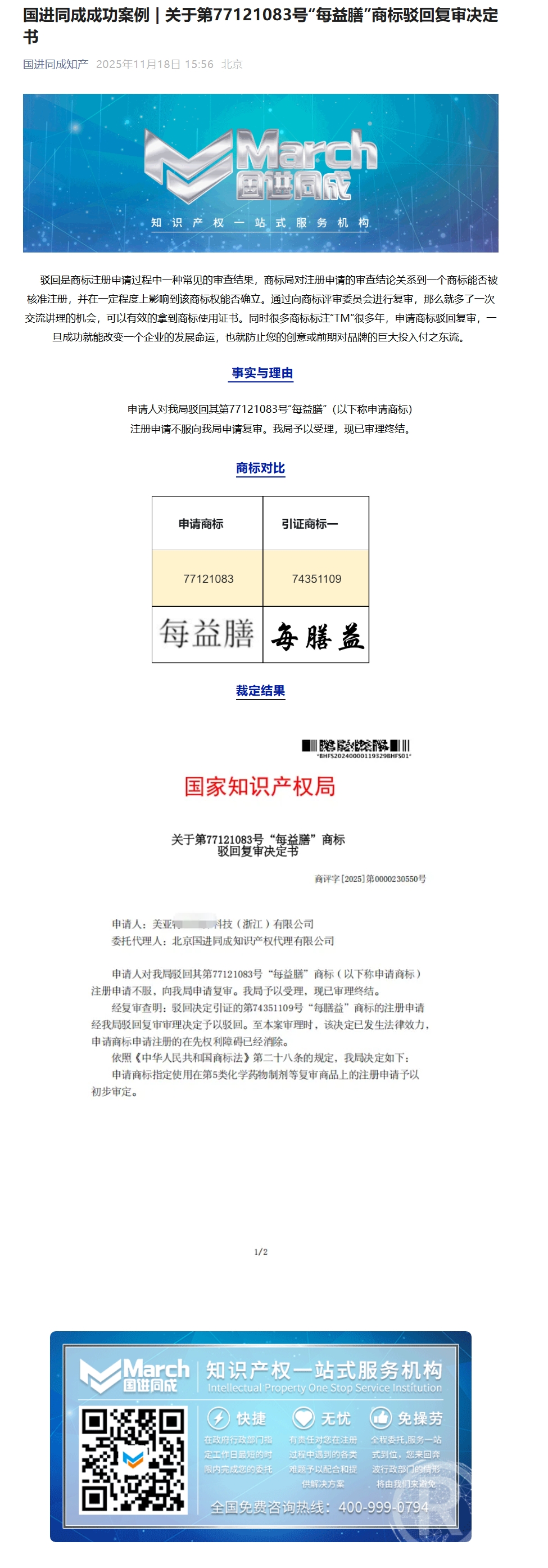 国进同成成功案例 | 关于第77121083号“每益膳”商标驳回复审决定书