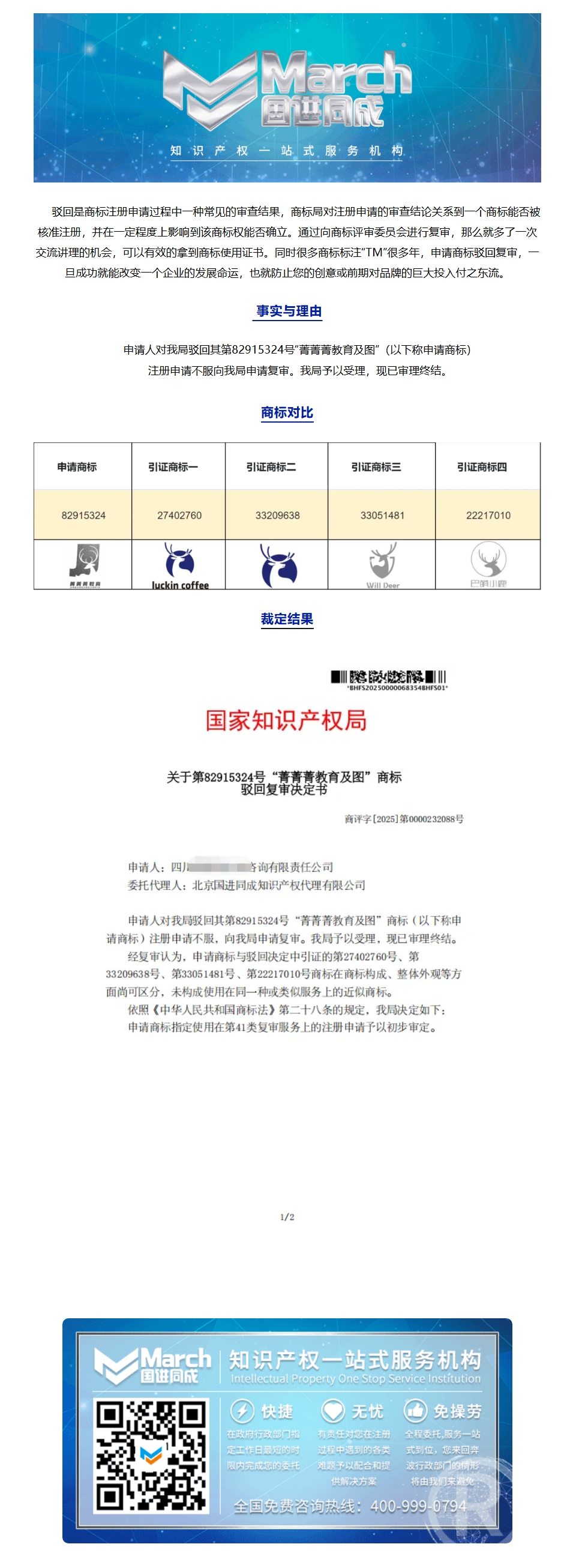 国进同成成功案例 | 关于第82915324号“菁菁菁教育及图”商标驳回复审决定书