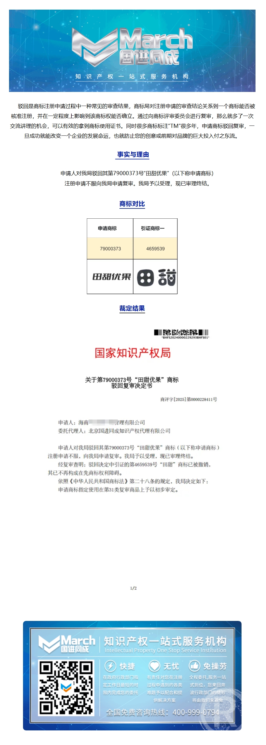 国进同成成功案例 | 关于第79000373号“田甜优果”商标驳回复审决定书