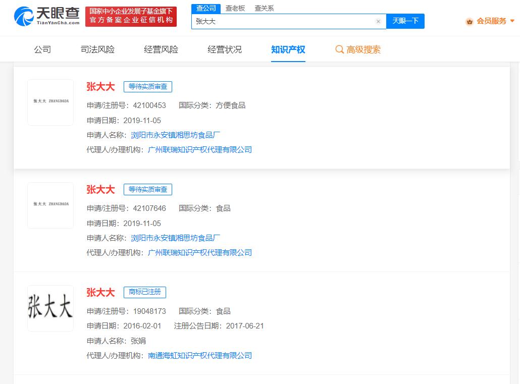 此外,知识产权信息显示,“张大大”已被多个公司及自然人申请注册商标,申请人包括上海某餐饮公司、湖南某食品厂及多个张姓自然人等,这些商标最早申请于2015年5月,国际分类包括教育娱乐、方便食品、广告销售等,其中多枚商标已注册成功。