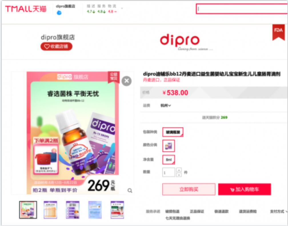 在进一步调查后发现,销售上述仿冒商品的店铺为重庆芈宝科技发展有限公司(以下简称“重庆芈宝”)运营的“迪辅诺”店铺,其不仅在淘宝平台进行销售,在拼多多等平台也开设了销售仿冒商标产品的店铺。其销售的名为“迪辅乐动物双歧杆菌Bb-12滴液饮品”“迪辅乐安必宝戊糖片球菌滴液饮品”的商品,在商品名称、商品信息页面、产品包装和外观显著位置均标识了“迪辅乐”、“dipro”商标,与迪辅乐生物(上海)有限公司自德贝康爱处受让的第 32731382 号第 5 类“迪辅乐”商标构成相同。