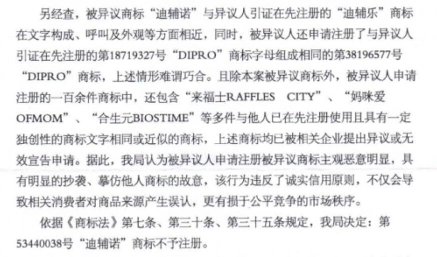 而值得一提的是,根据公开信息发现,重庆芈宝及迪辅诺贸易的法人丁绍成自2019年5月起,就在多个类别上申请注册了大量与“迪辅乐”、“dipro”商标相同或者近似的商标,以及与迪辅乐益生菌滴剂产品型号、名称相关的商标。虽然国家知识产权局于2021年7月、9月、10月,以丁绍成的行为具有明显恶意,争议商标的注册构成了《商标法》第四十四条第一款所指的“以其他不正当手段取得注册”的情形为由,分别对丁绍成注册的商标做出四份无效宣告请求裁定书,但丁绍成在上述商标无效宣告审查期间及被予以宣告无效后,依然持续申请了大量与“迪辅乐”、“dipro”相关,或者与迪辅乐益生菌滴剂产品型号、名称相关的商标。