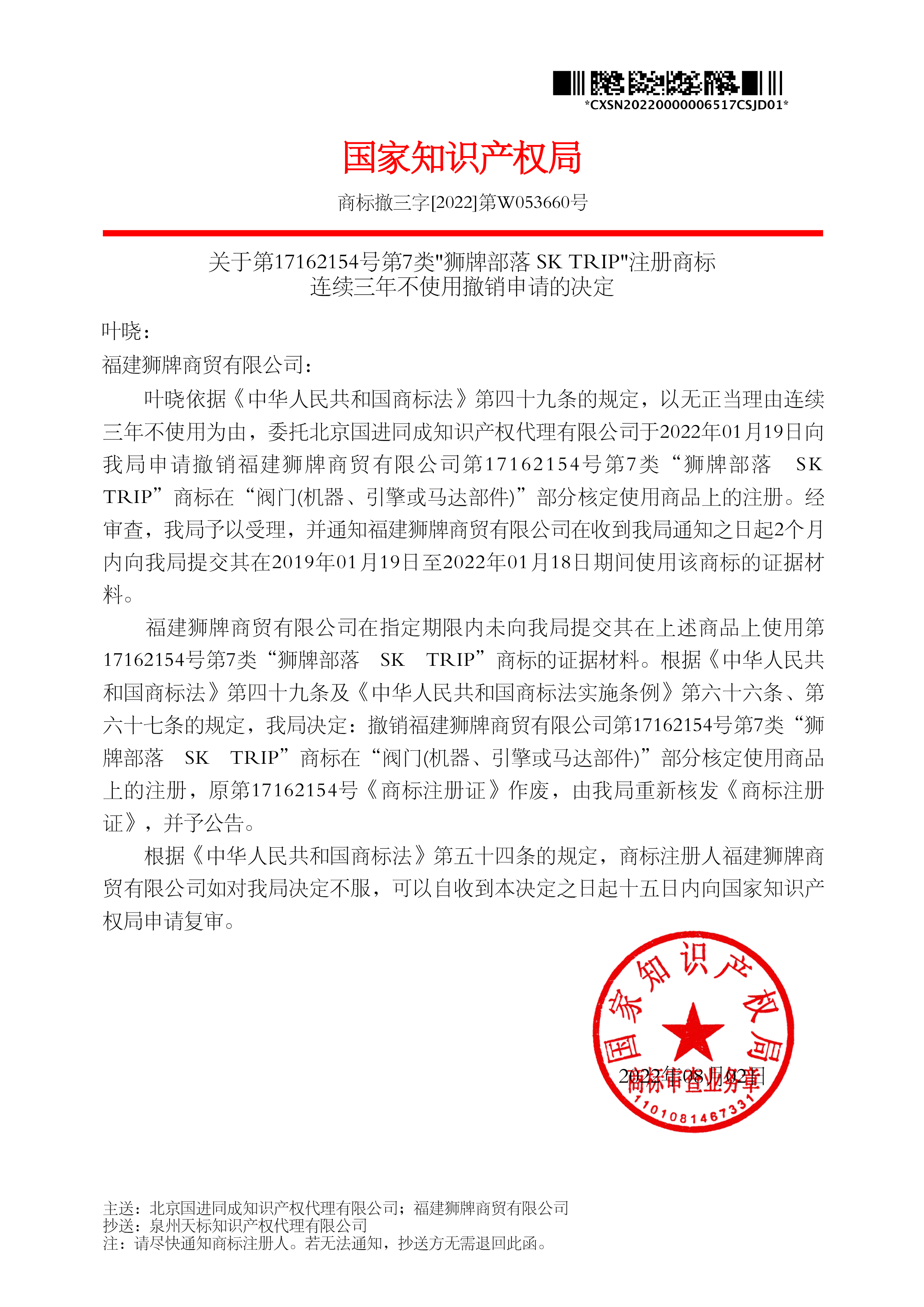 关于第17162154号第7类"狮牌部落 SK TRIP"注册商标 连续三年不使用撤销申请的决定