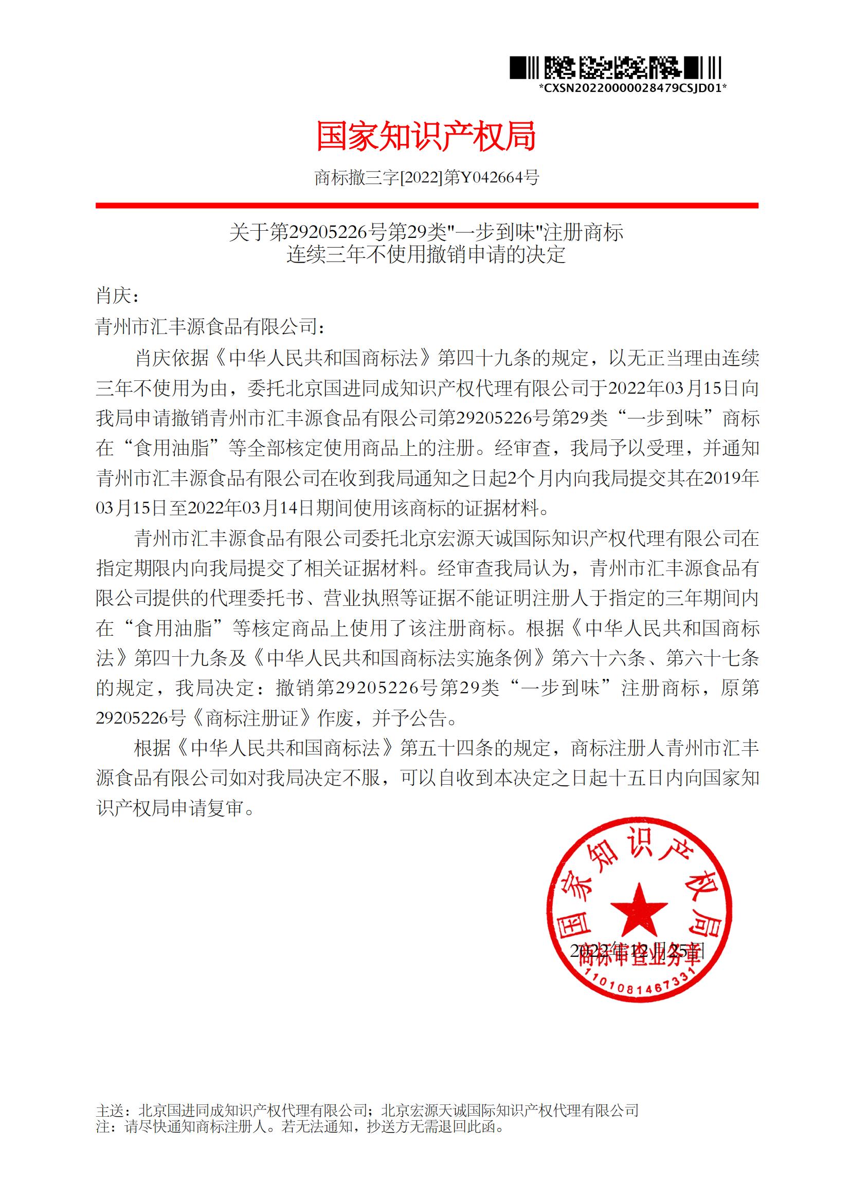 关于第29205226号第29类"一步到味"注册商标 连续三年不使用撤销申请的决定