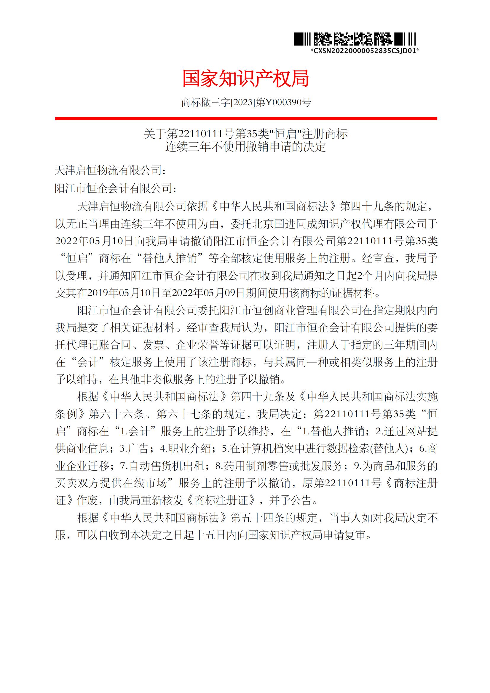 关于第22110111号第35类"恒启"注册商标 连续三年不使用撤销申请的决定