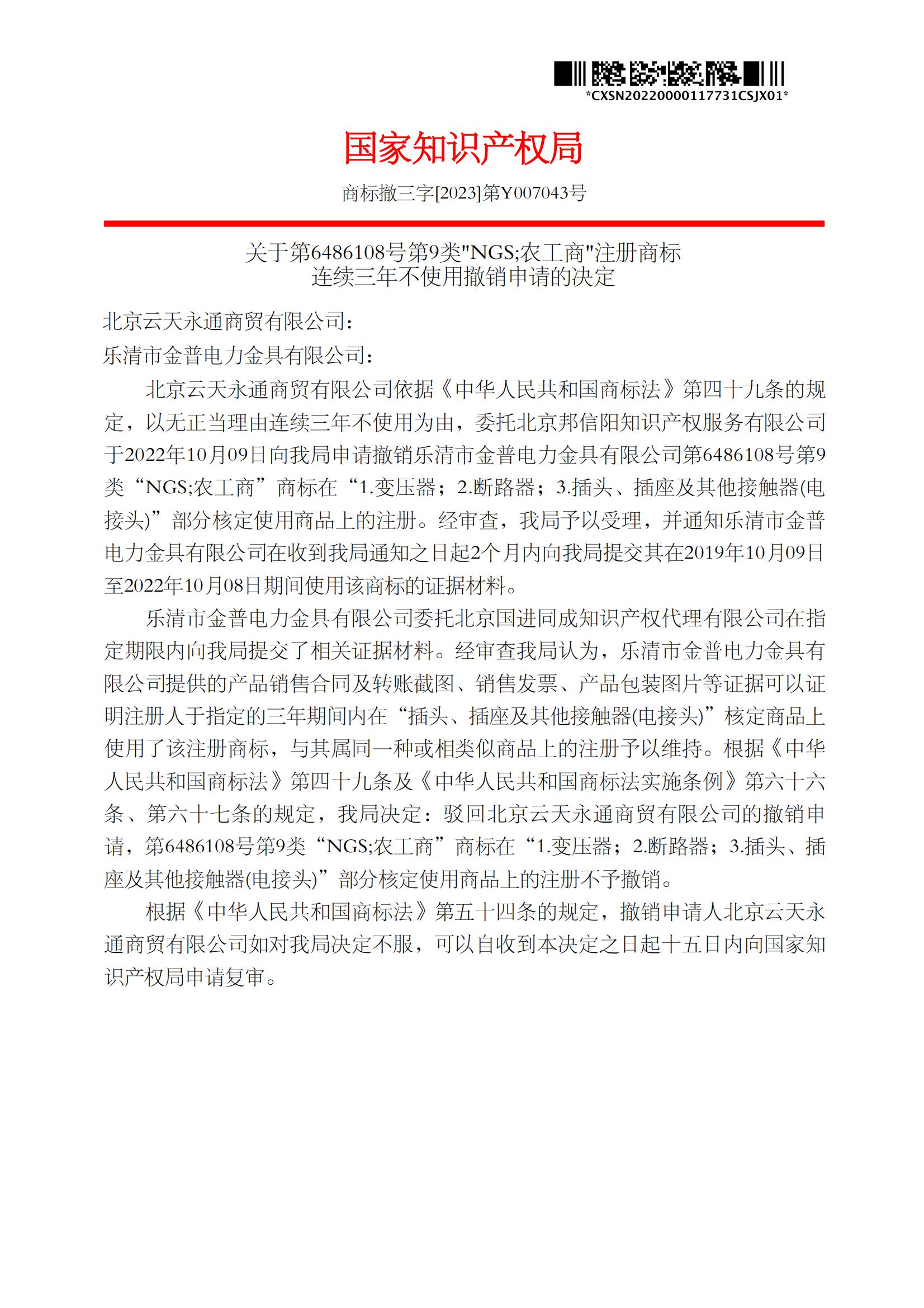关于第6486108号第9类"NGS;农工商"注册商标 连续三年不使用撤销申请的决定