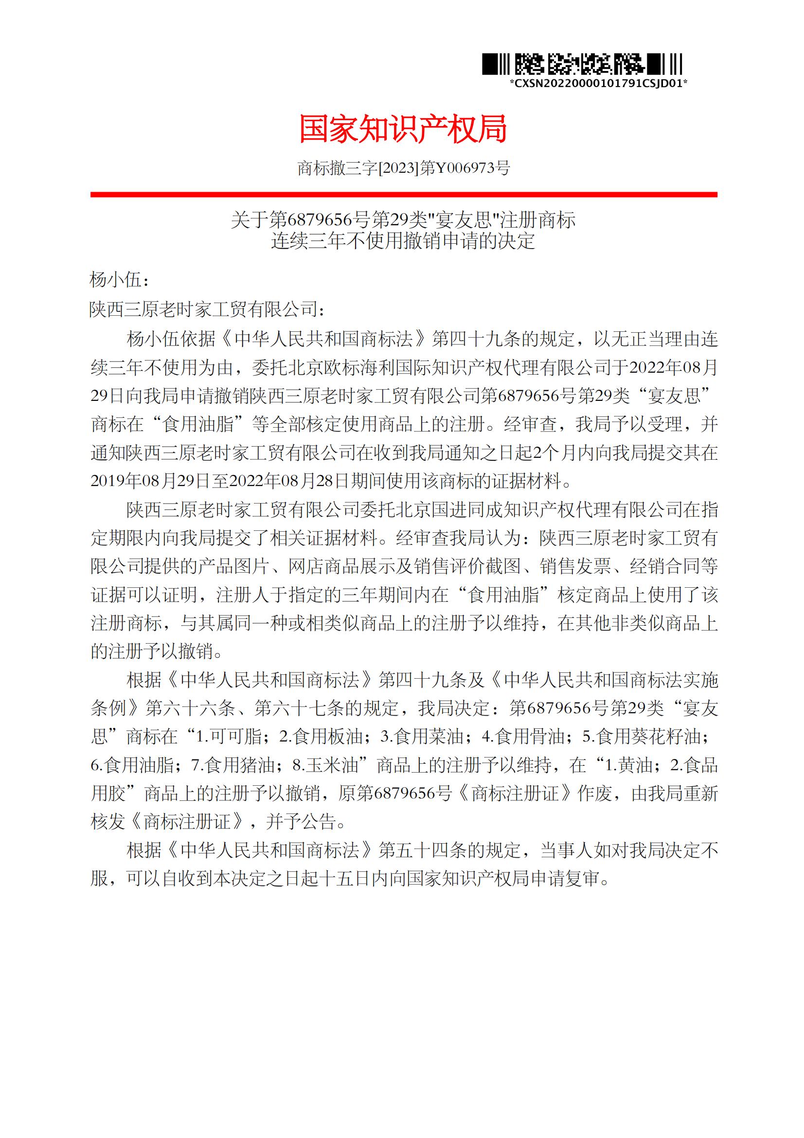 关于第6879656号第29类"宴友思"注册商标 连续三年不使用撤销申请的决定