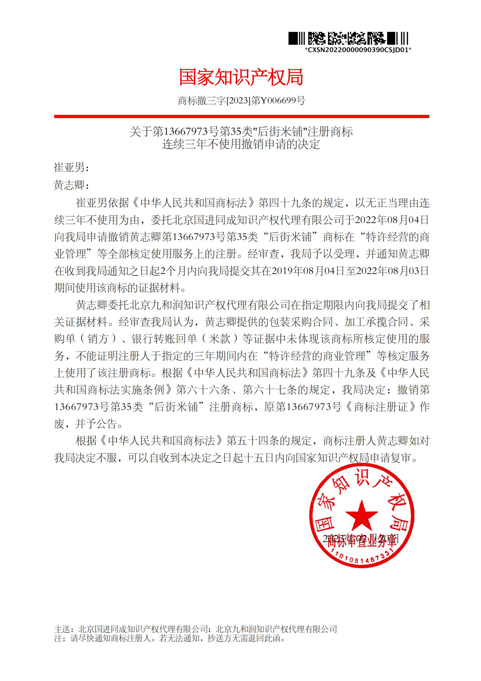 关于第13667973号第35类"后街米铺"注册商标 连续三年不使用撤销申请的决定