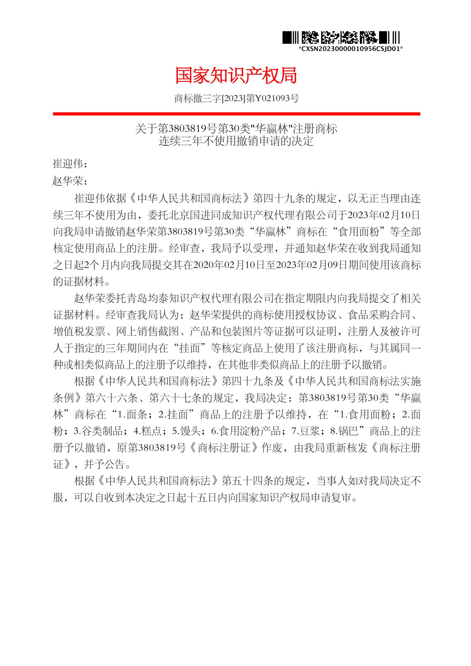 关于第3803819号第30类"华赢林"注册商标 连续三年不使用撤销申请的决定