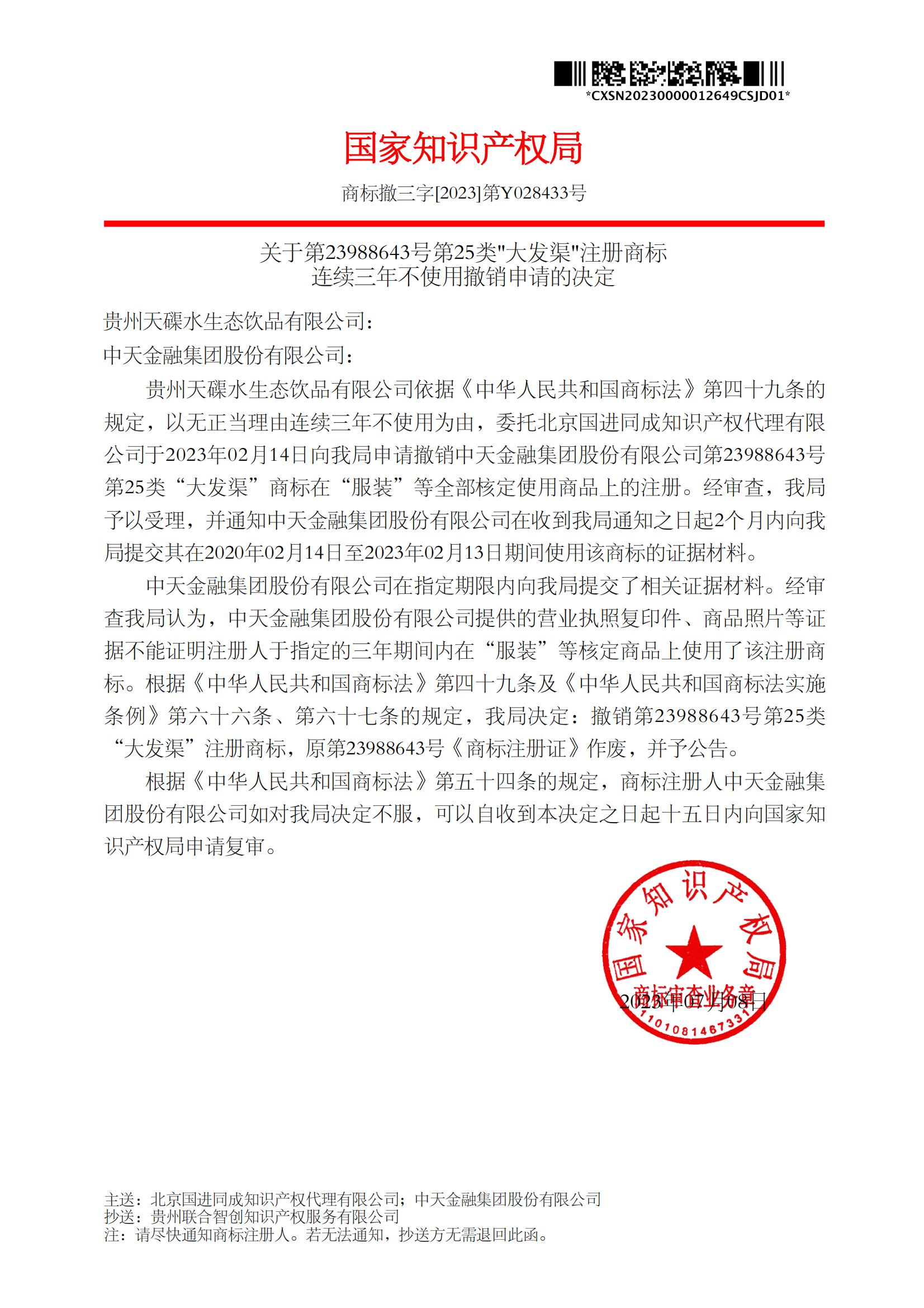 关于第23988643号第25类"大发渠"注册商标 连续三年不使用撤销申请的决定