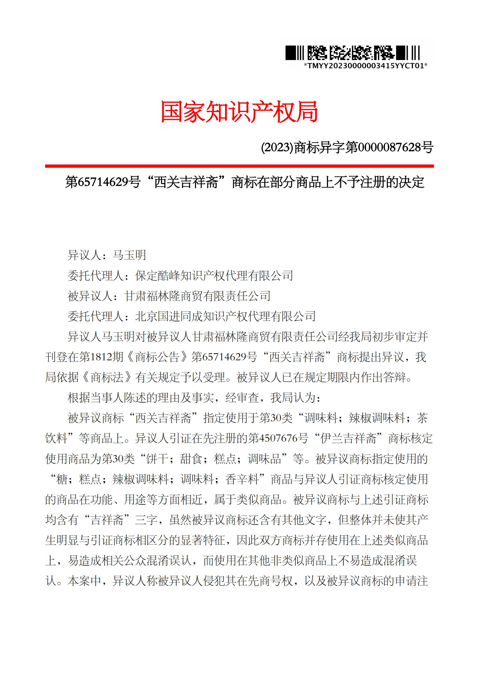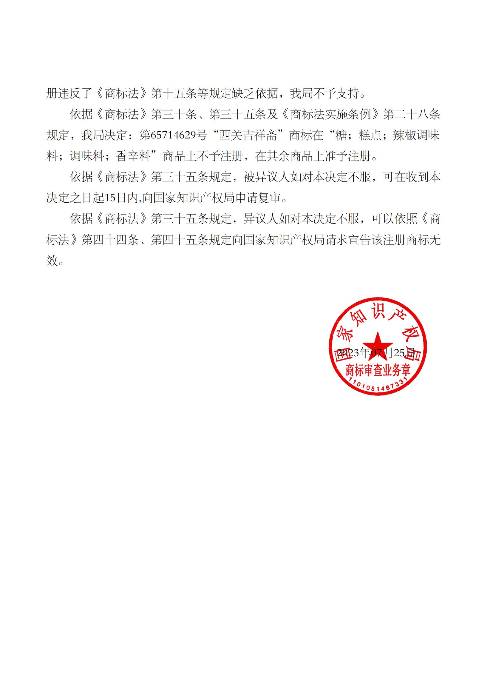 第65714629号“西关吉祥斋”商标在部分商品上不予注册的决定