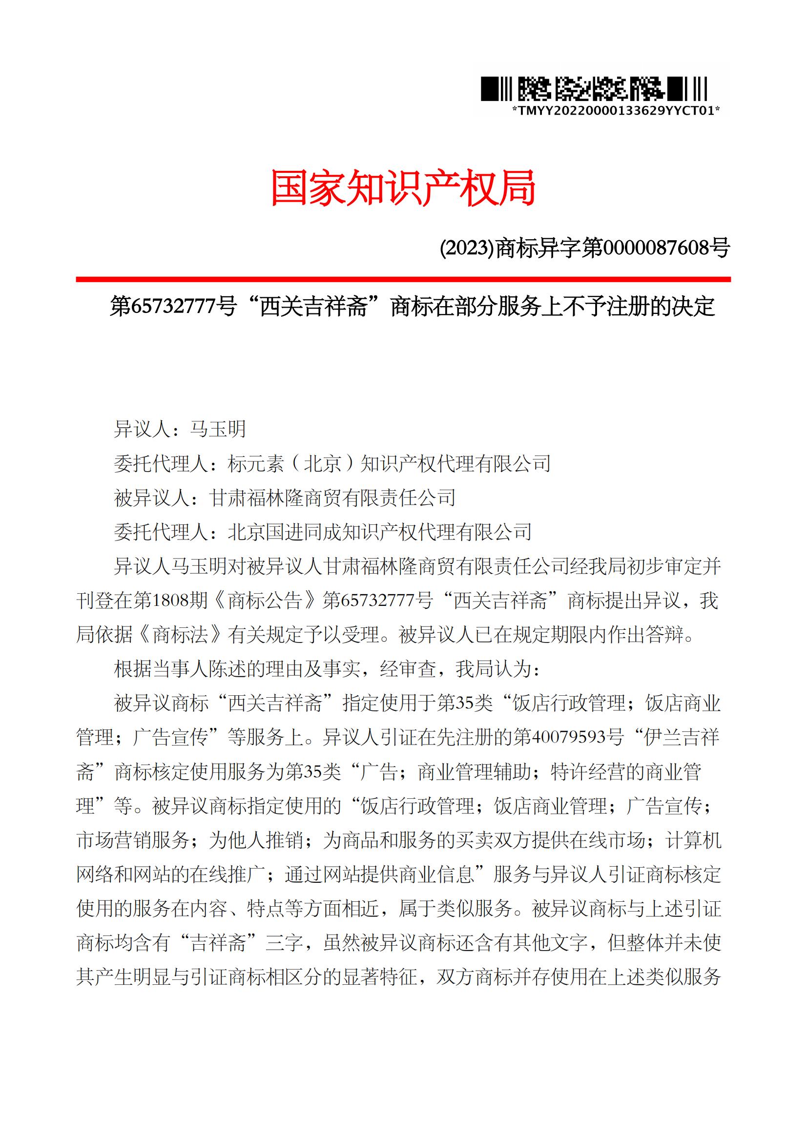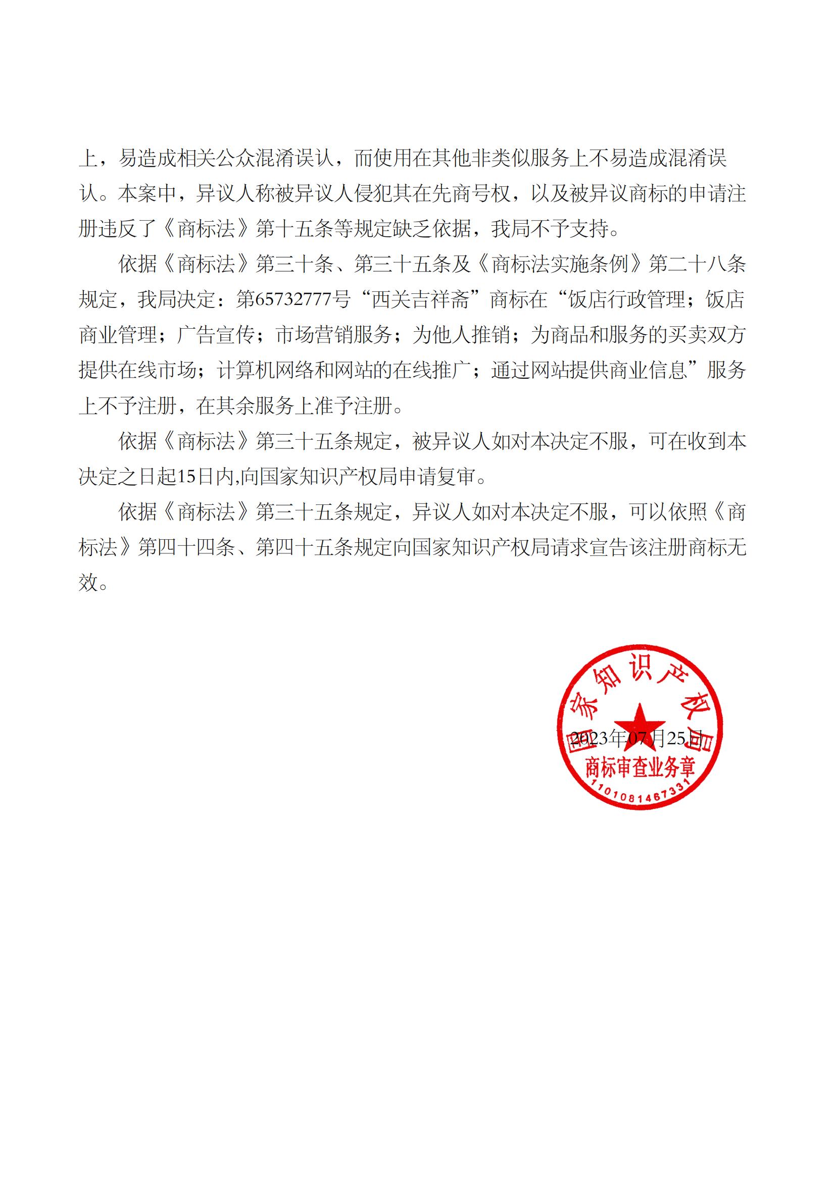 第65732777号“西关吉祥斋”商标在部分服务上不予注册的决定