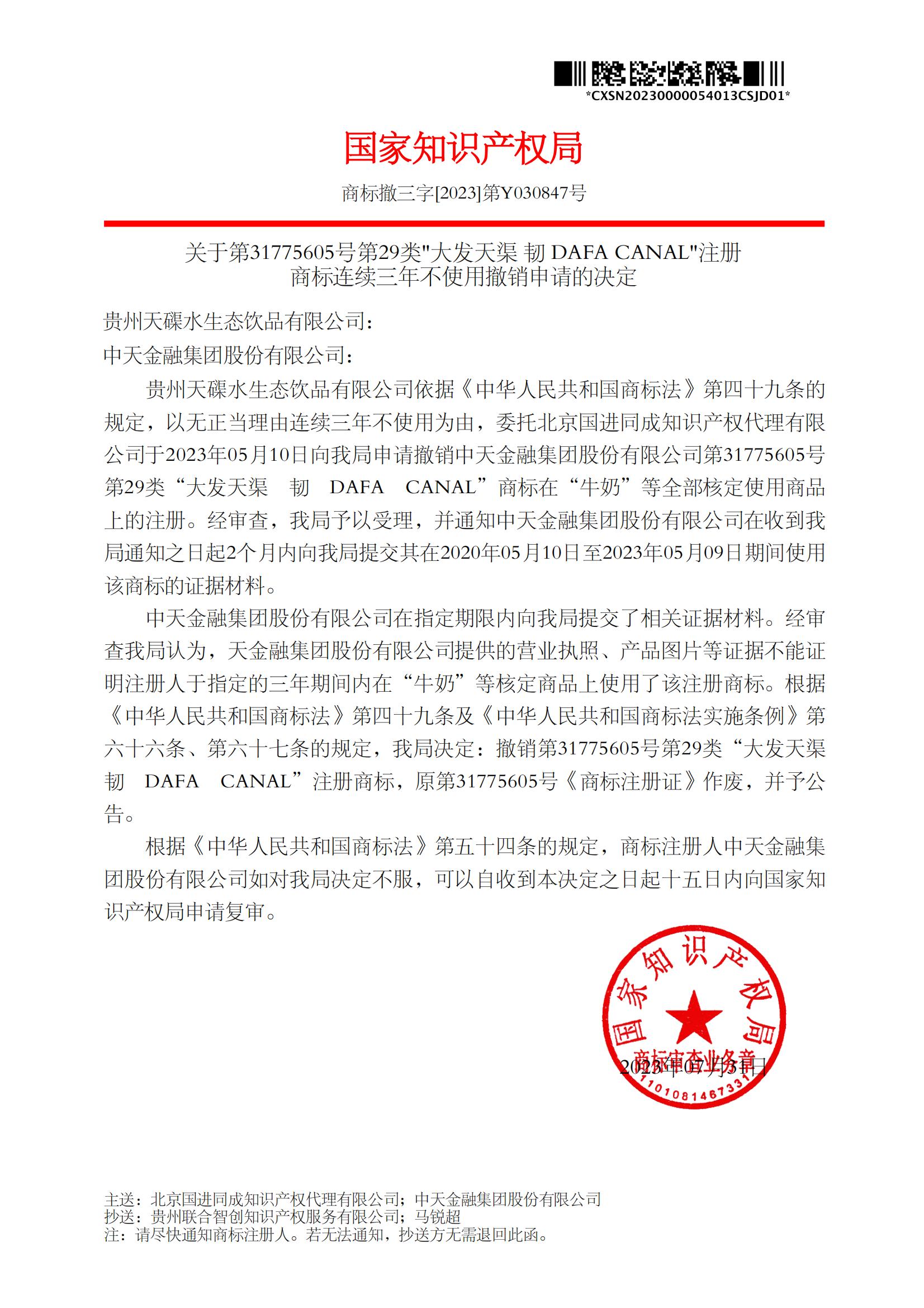 关于第31775605号第29类"大发天渠 韧 DAFA CANAL"注册 商标连续三年不使用撤销申请的决定