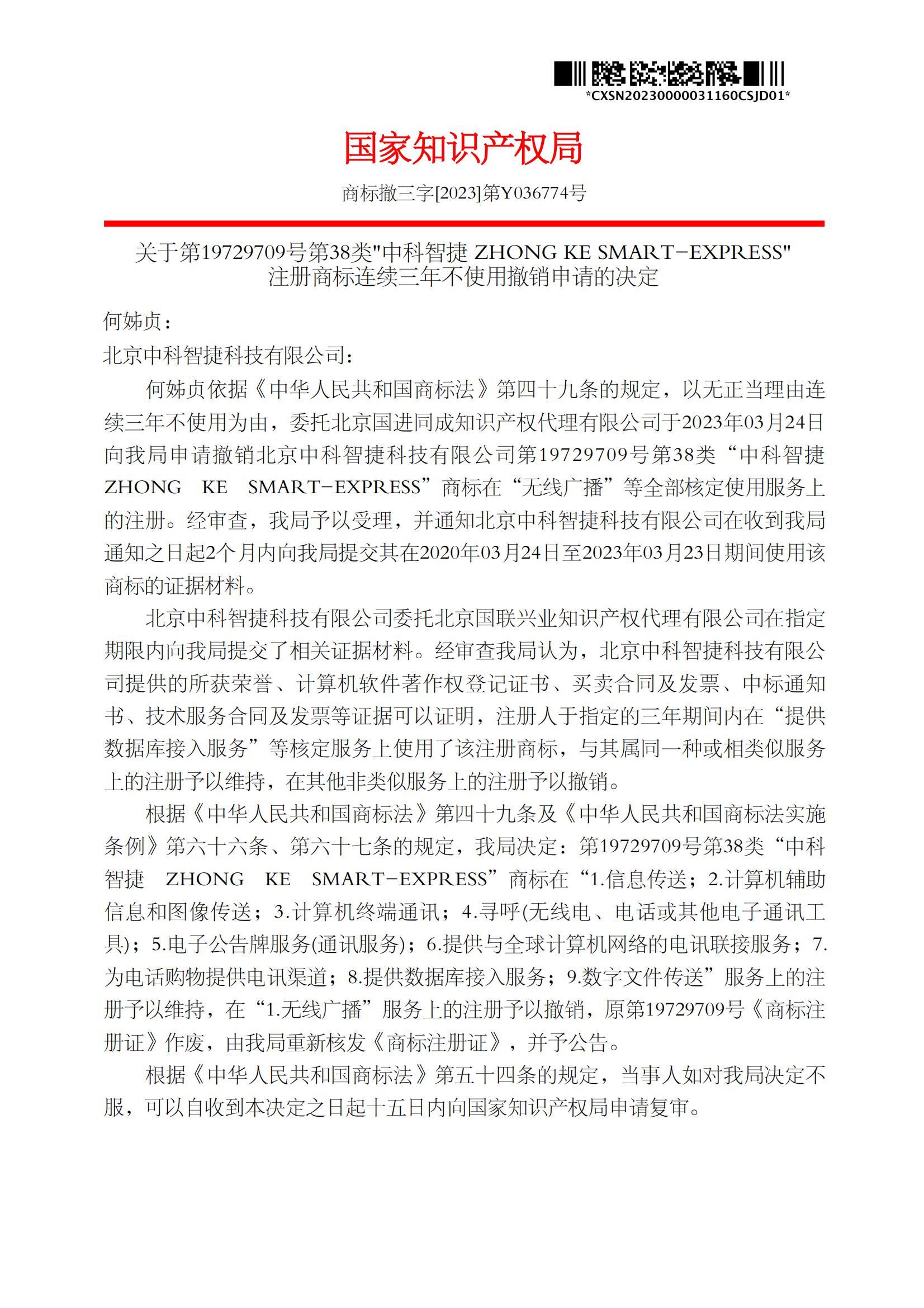 关于第19729709号第38类"中科智捷 ZHONG KE SMART-EXPRESS" 注册商标连续三年不使用撤销申请的决定