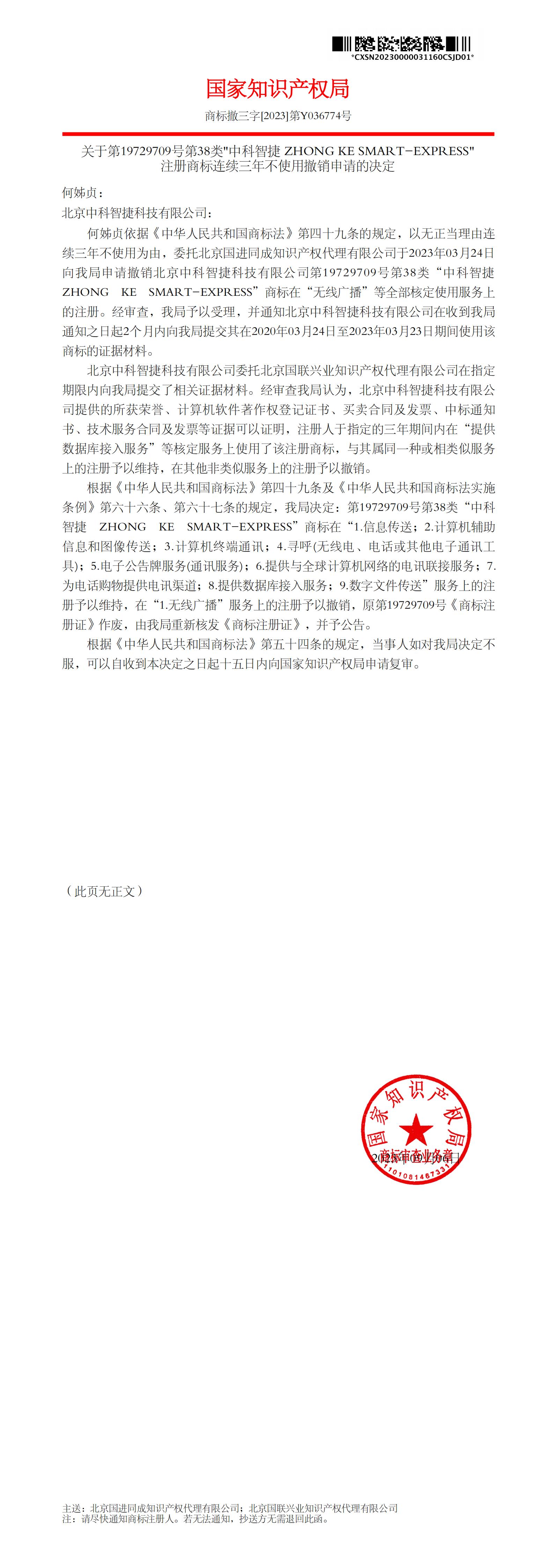 关于第19729709号第38类"中科智捷 ZHONG KE SMART-EXPRESS" 注册商标连续三年不使用撤销申请的决定