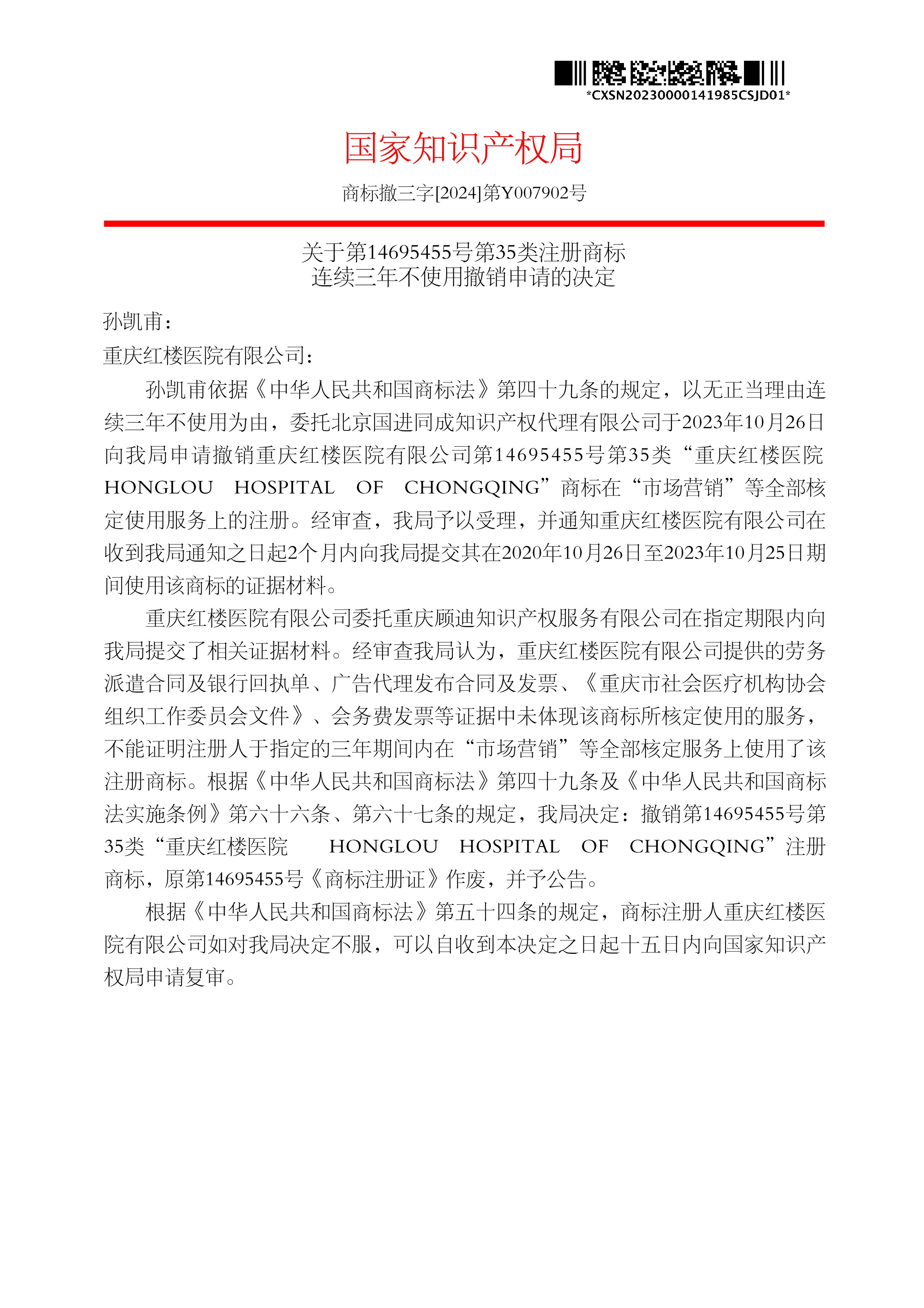 关于第14695455号第35类注册商标 连续三年不使用撤销申请的决定