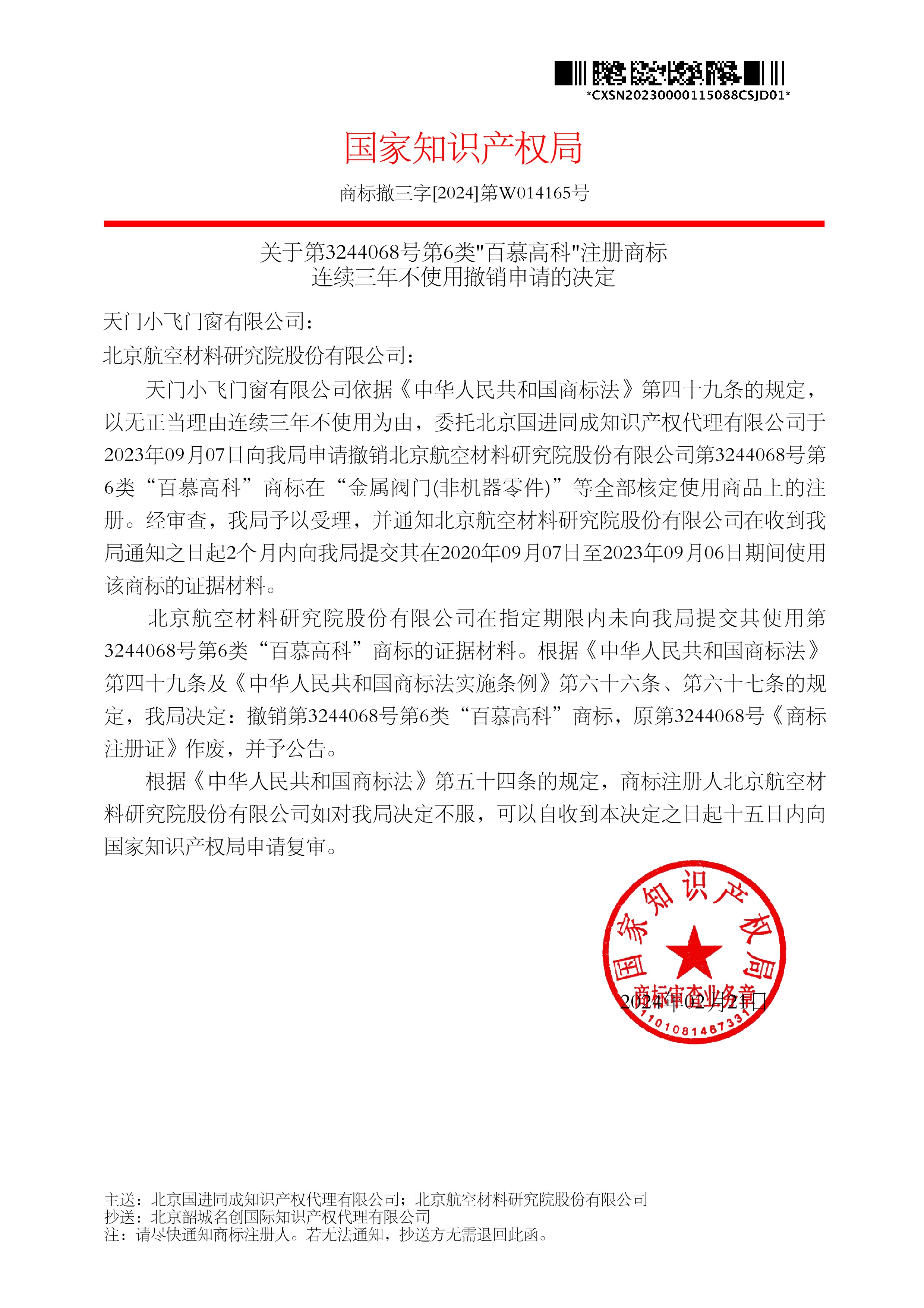 关于第3244068号第6类"百慕高科"注册商标 连续三年不使用撤销申请的决定