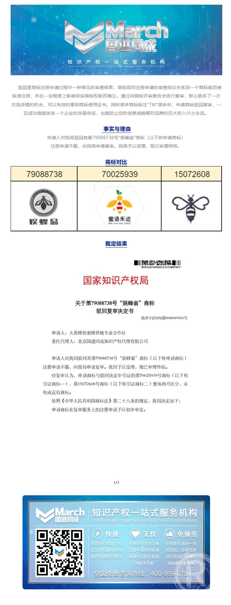 国进同成成功案例 | 关于第79088738号“娱蜂翁”商标驳回复审决定书