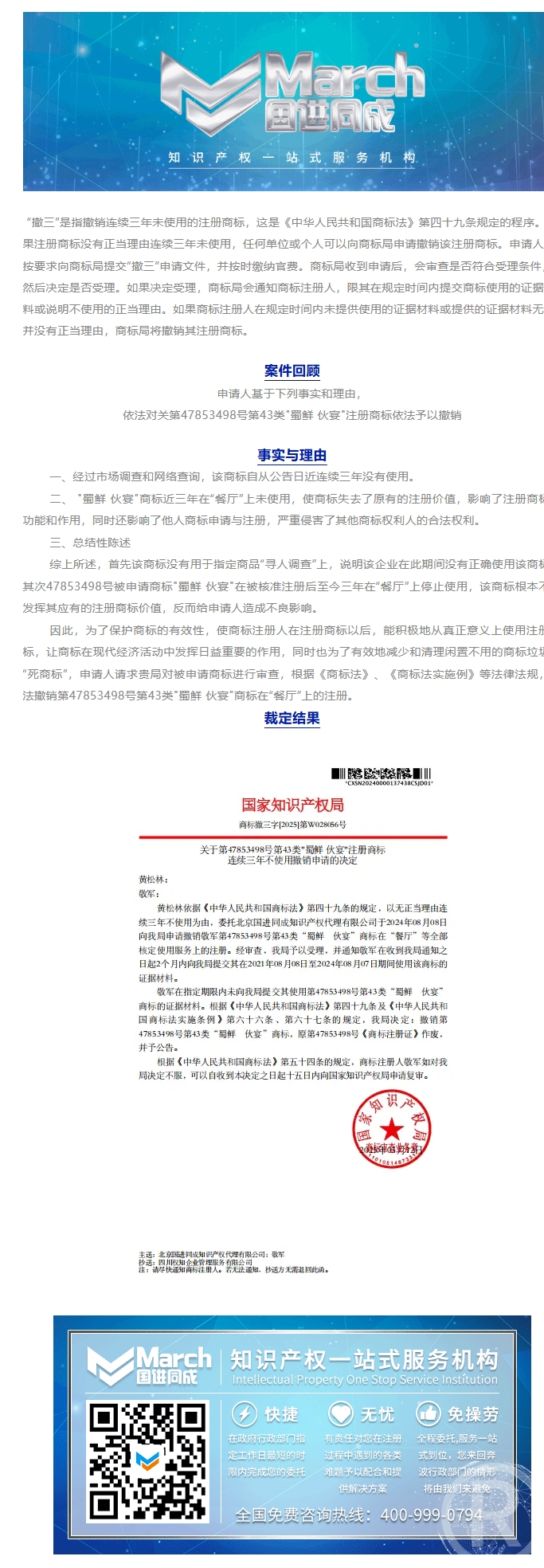 国进同成成功案例︱关于第47853498号第43类"蜀鲜 伙宴"注册商标连续三年不使用撤销申请的决定