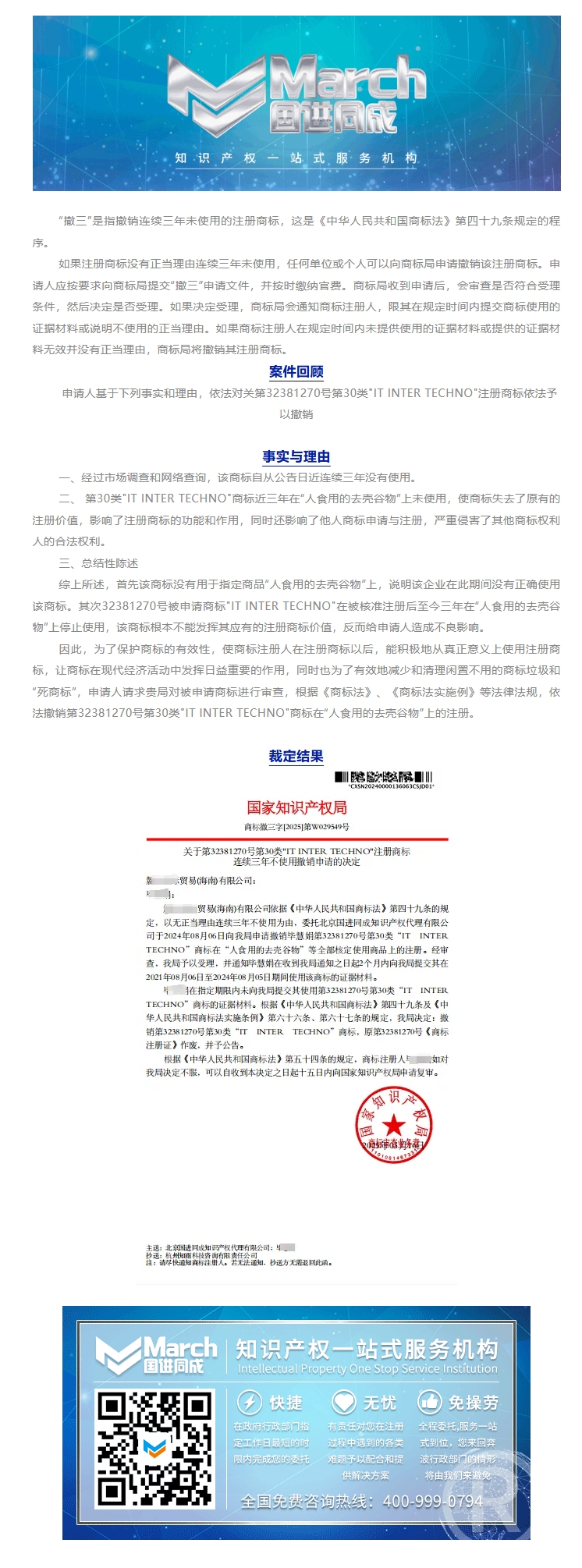 国进同成成功案例︱关于第32381270号第30类"IT INTER TECHNO"注册商标连续三年不使用撤销申请的决定