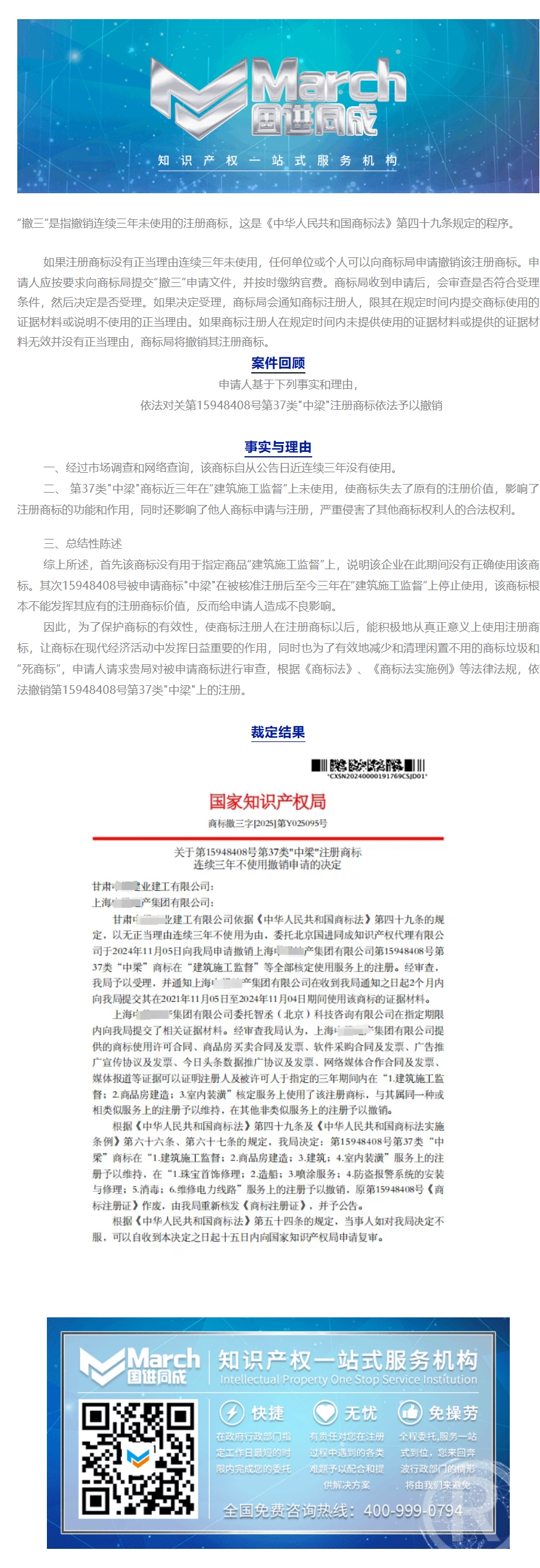 国进同成成功案例︱关于第15948408号第37类"中梁"注册商标连续三年不使用撤销申请的决定