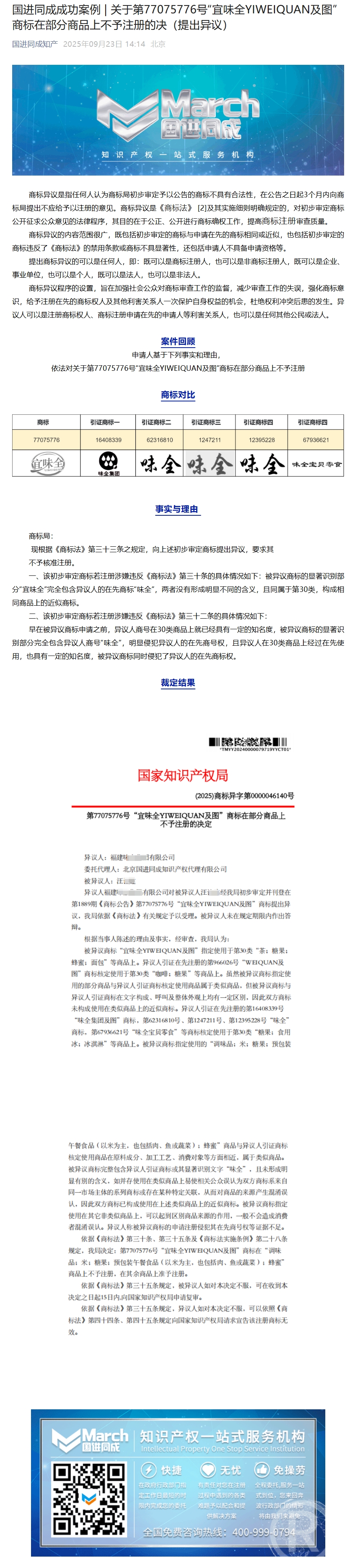 国进同成成功案例 | 关于第77075776号“宜味全YIWEIQUAN及图”商标在部分商品上不予注册的决(提出异议)