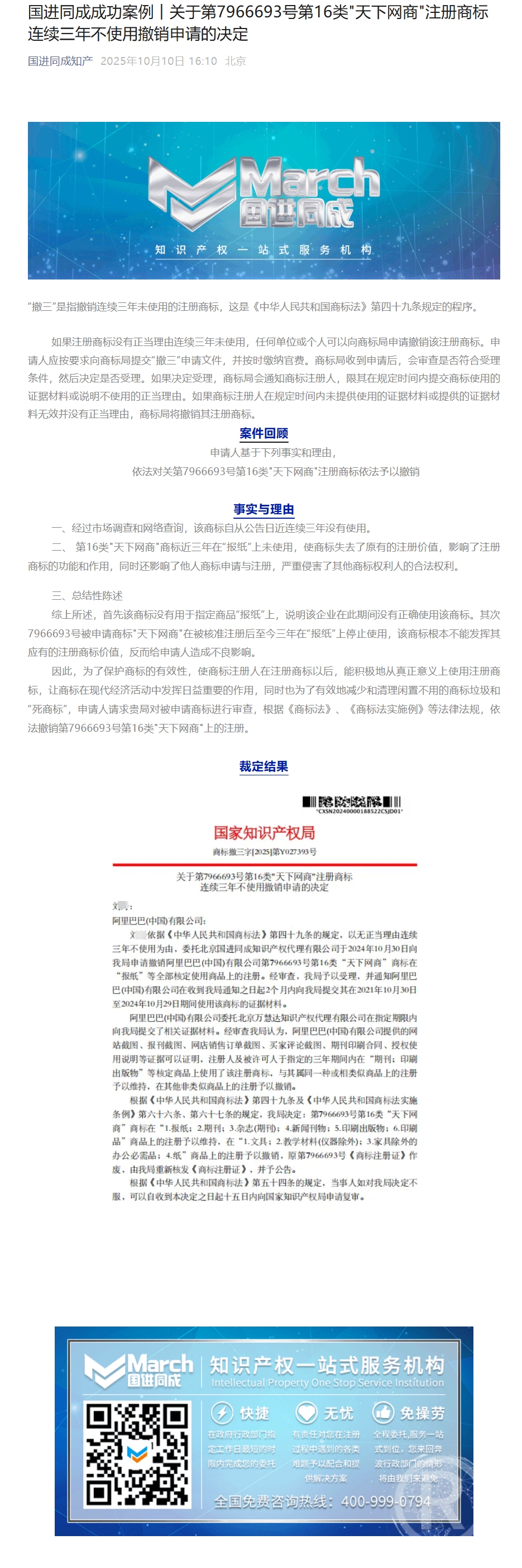 国进同成成功案例︱关于第7966693号第16类"天下网商"注册商标连续三年不使用撤销申请的决定