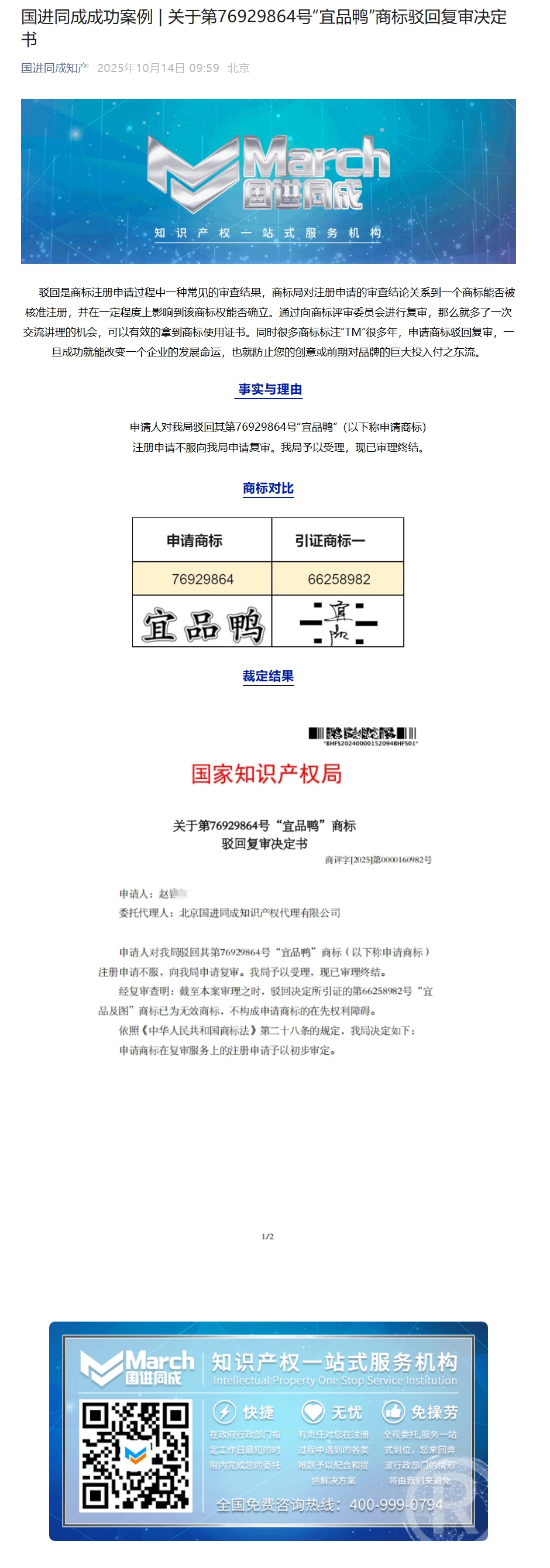国进同成成功案例 | 关于第76929864号“宜品鸭”商标驳回复审决定书