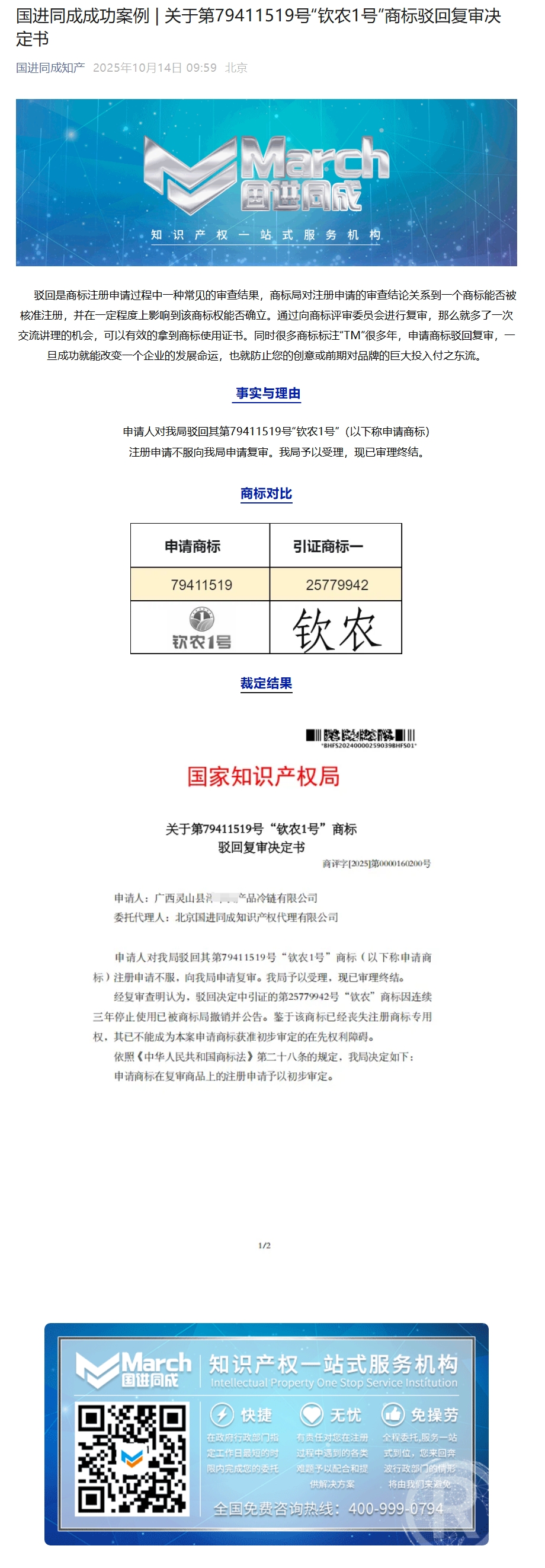 国进同成成功案例 | 关于第79411519号“钦农1号”商标驳回复审决定书