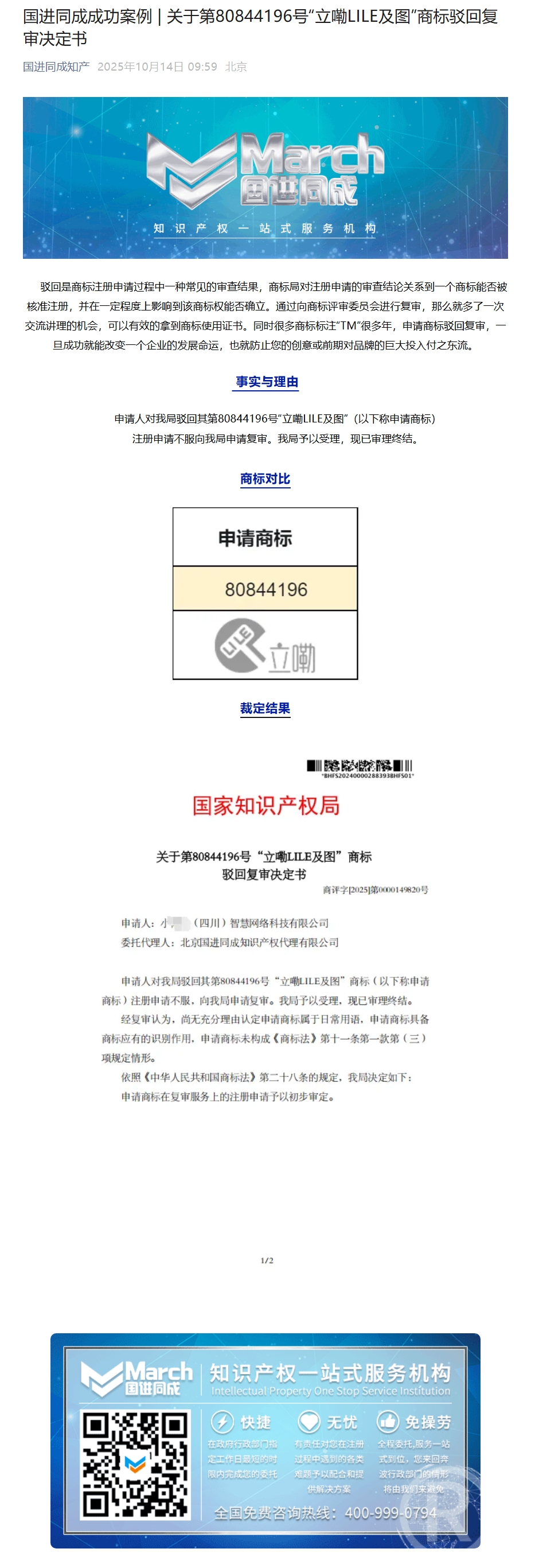 国进同成成功案例 | 关于第80844196号“立嘞LILE及图”商标驳回复审决定书