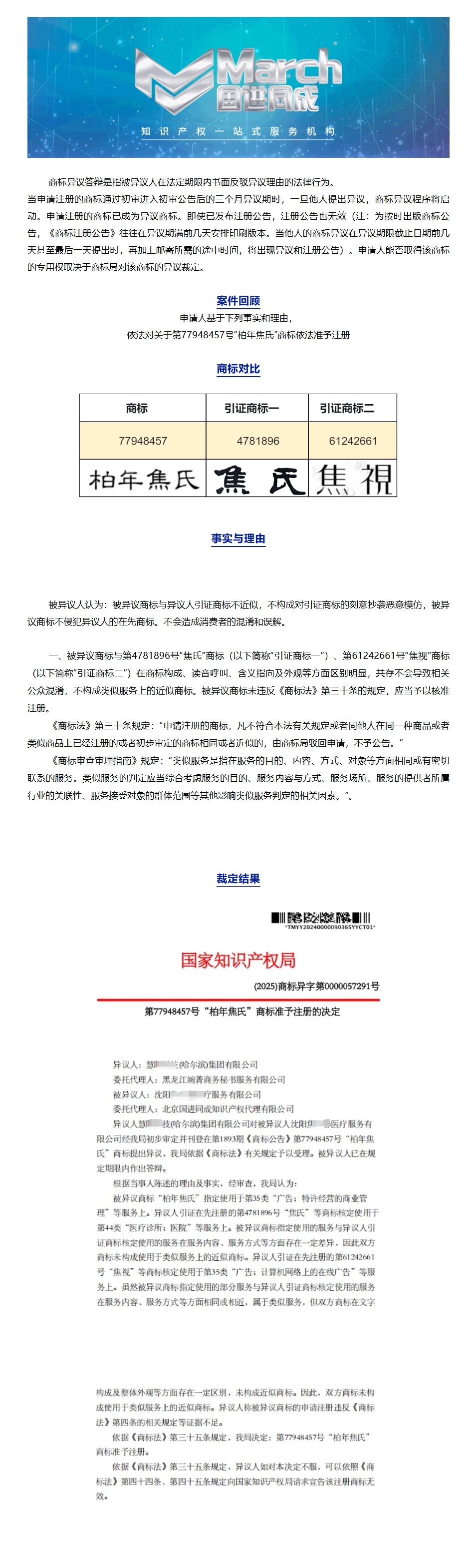 国进同成成功案例︱关于第77948457号“柏年焦氏”商标准予注册的决定(异议答辩)