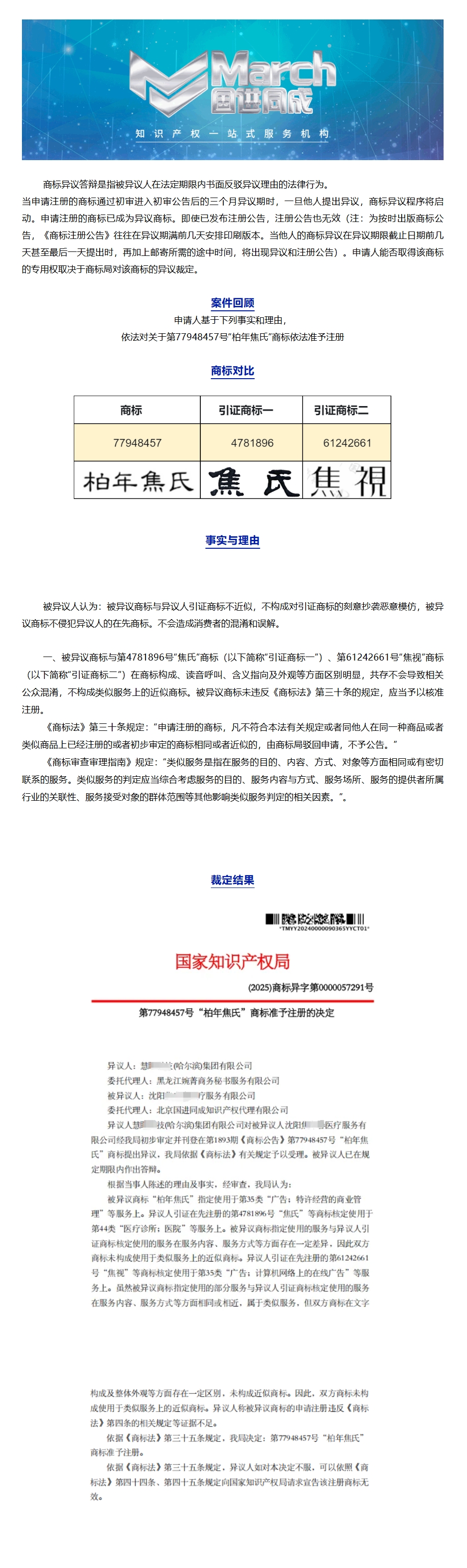 国进同成成功案例︱关于第77948457号“柏年焦氏”商标准予注册的决定(异议答辩)