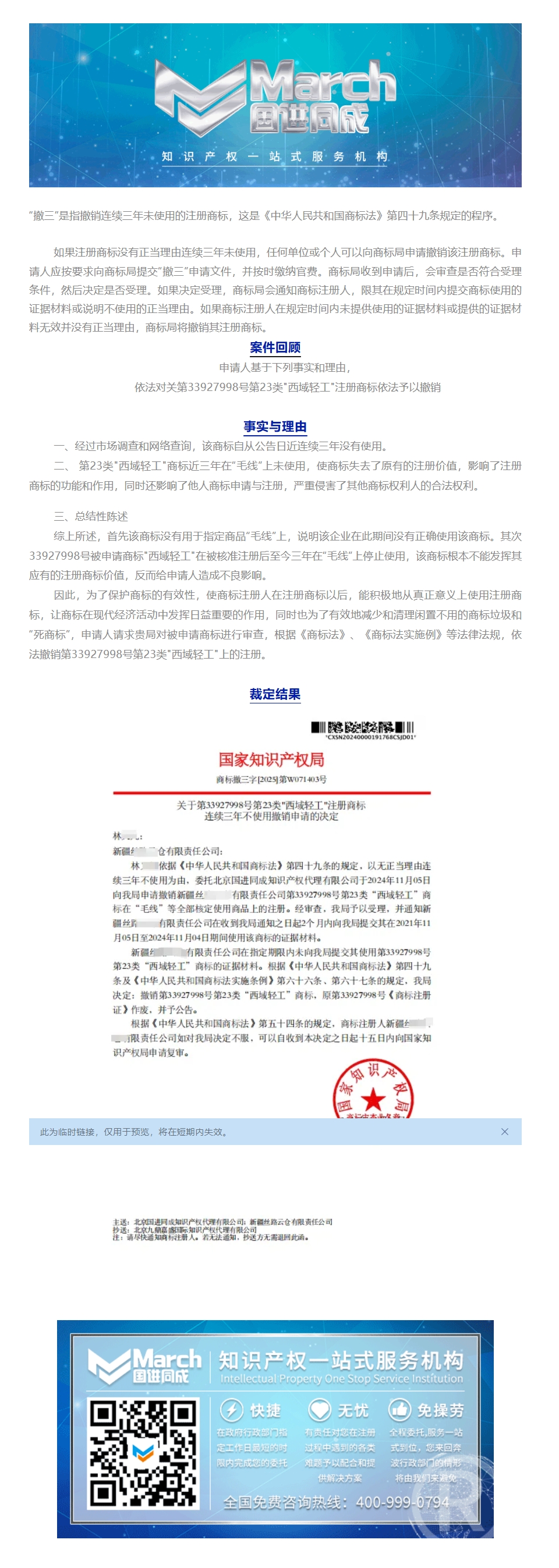 国进同成成功案例︱关于第33927998号第23类"西域轻工"注册商标连续三年不使用撤销申请的决定