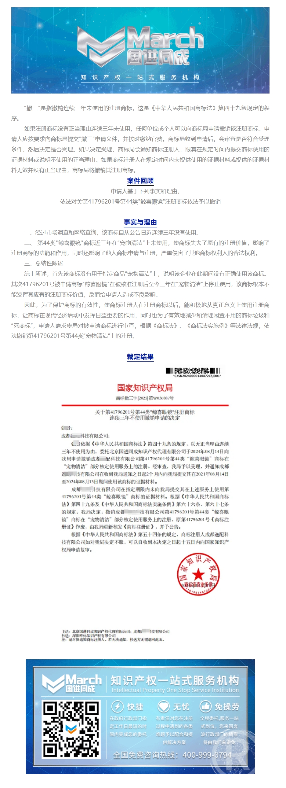 国进同成成功案例︱关于第41796201号第44类"鲸喜眼镜"注册商标连续三年不使用撤销申请的决定