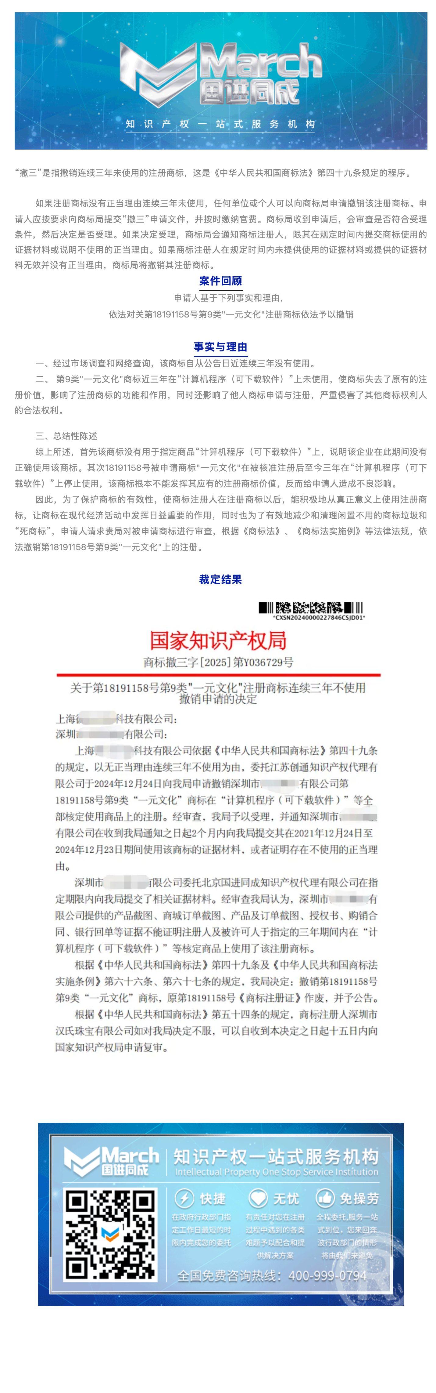 国进同成成功案例︱关于第18191158号第9类"一元文化"注册商标连续三年不使用撤销申请的决定