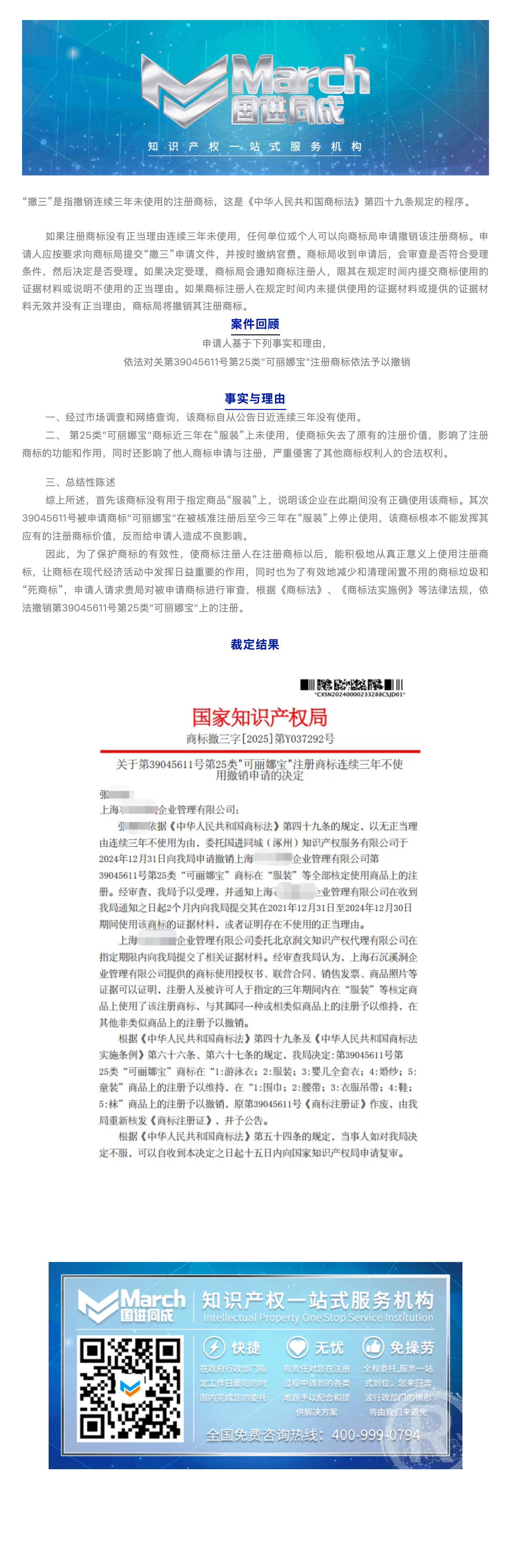 国进同成成功案例︱关于第39045611号第25类"可丽娜宝"注册商标连续三年不使用撤销申请的决定