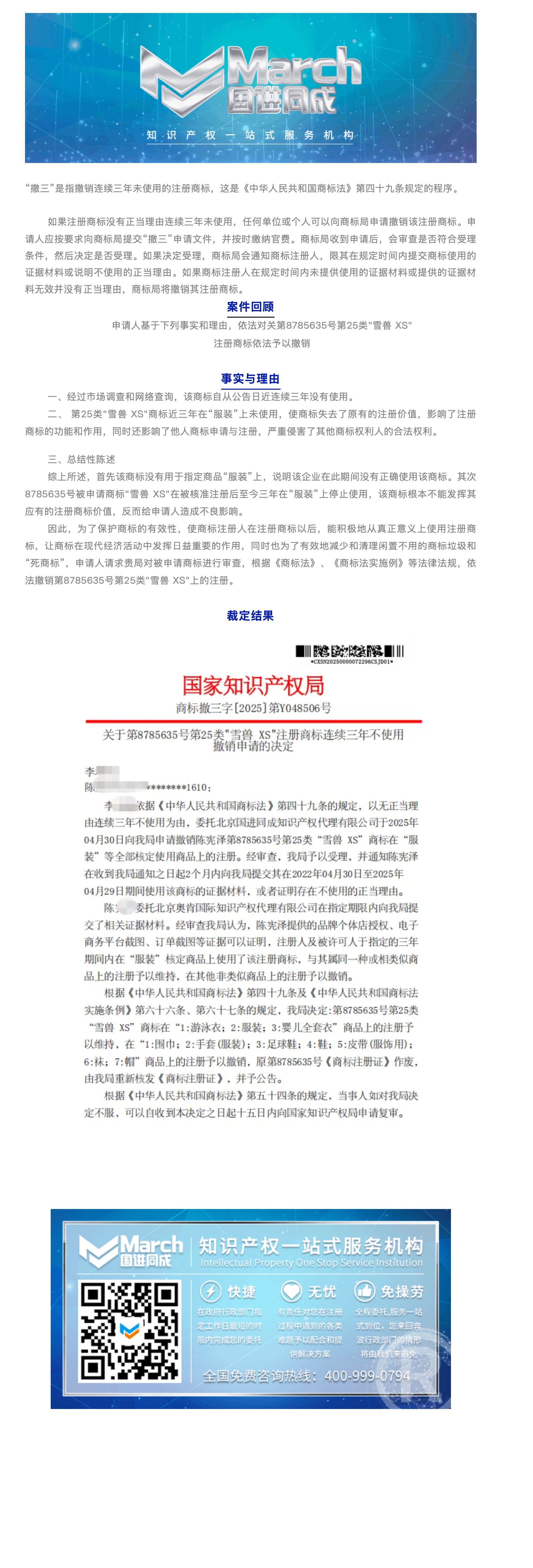 国进同成成功案例︱关于第8785635号第25类"雪兽 XS"注册商标连续三年不使用撤销申请的决定