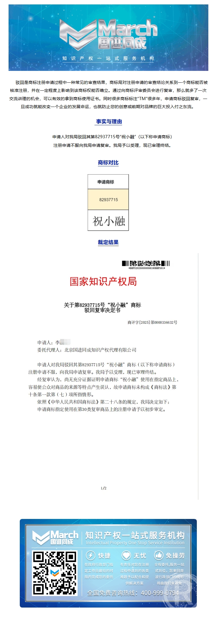 国进同成成功案例 | 关于第82937715号“祝小融”商标驳回复审决定书