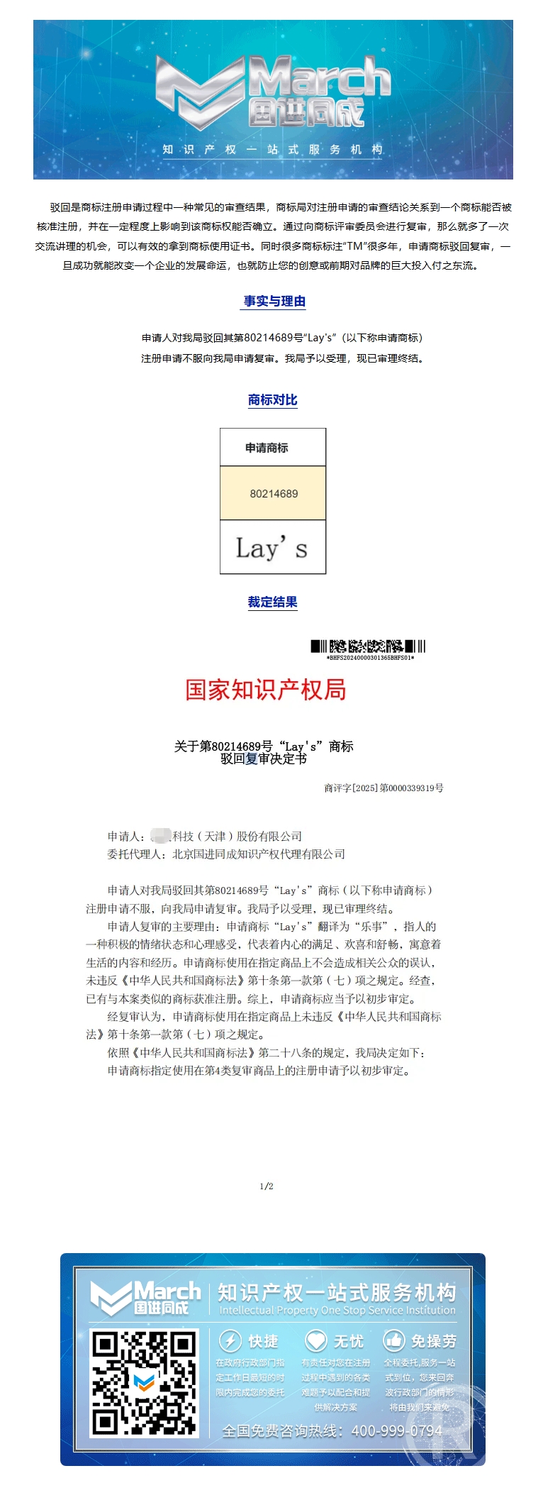 国进同成成功案例 | 关于第80214689号“Lays”商标驳回复审决定书