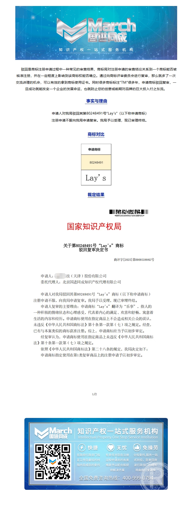 国进同成成功案例 | 关于第80248491号“Lays”商标驳回复审决定书
