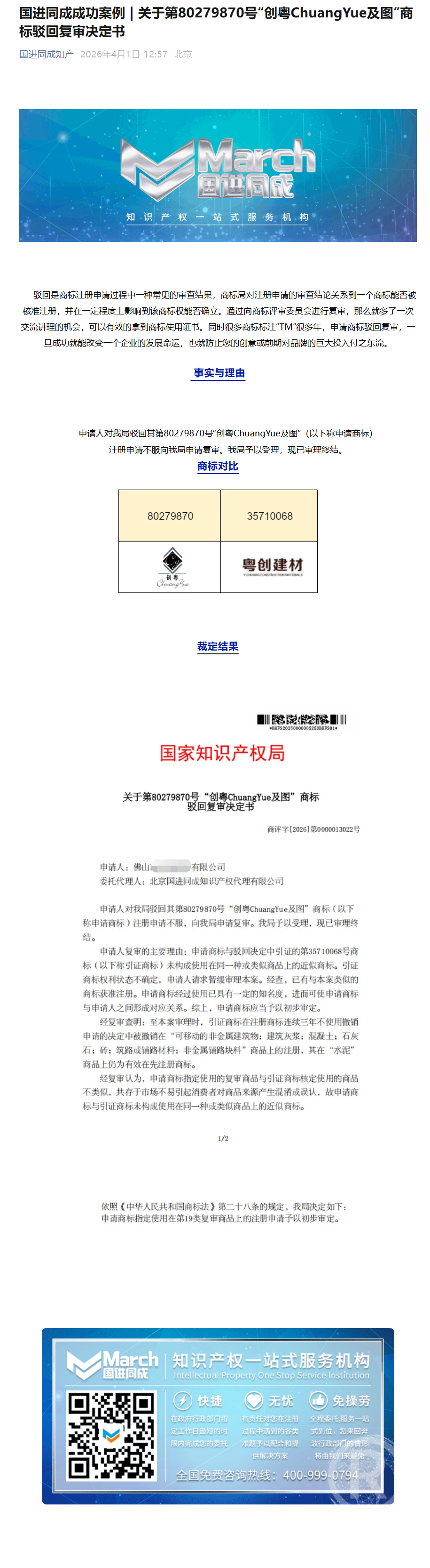 国进同成成功案例 | 关于第80279870号“创粤ChuangYue及图”商标驳回复审决定书