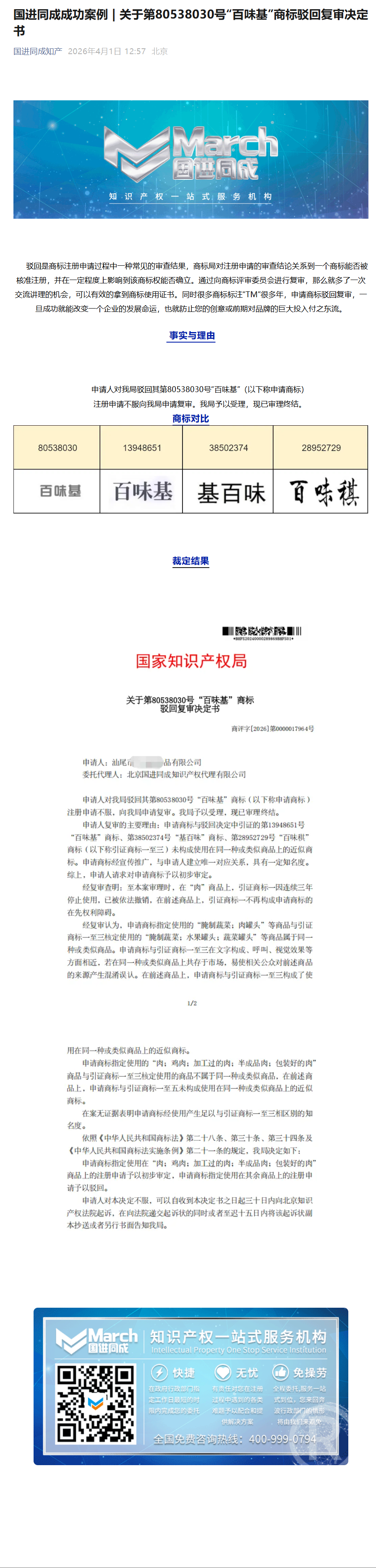国进同成成功案例 | 关于第80538030号“百味基”商标驳回复审决定书