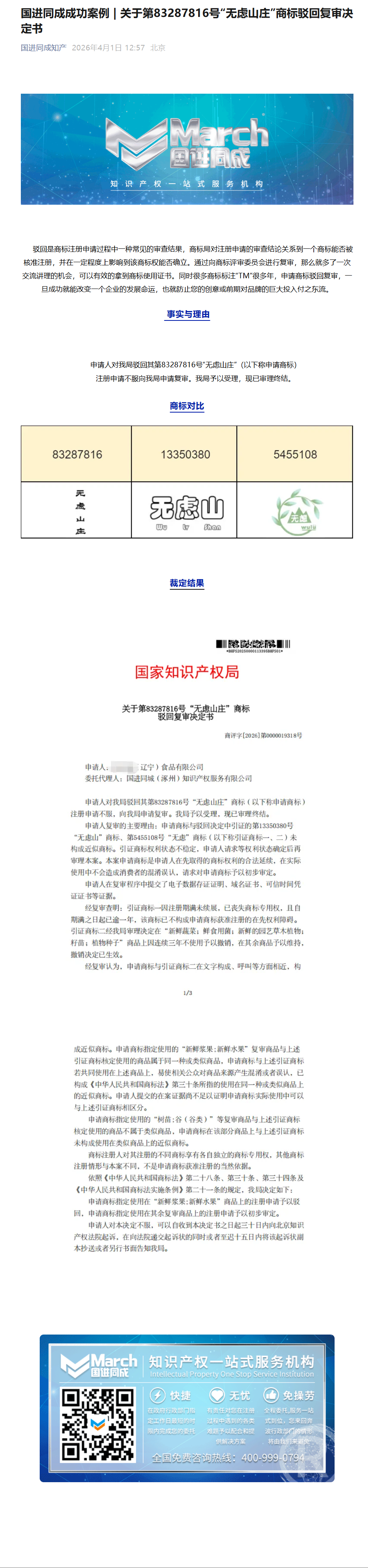 国进同成成功案例 | 关于第83287816号“无虑山庄”商标驳回复审决定书